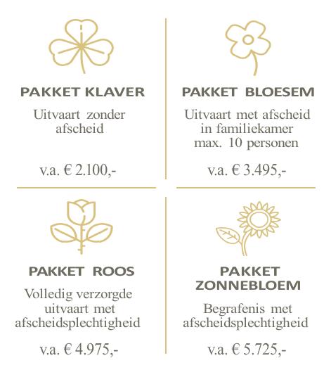 Van uit h et har t een ‘eigen’ afschei d Wij verzorgen en begeleiden begrafenissen en crematies in de regio Hoeksche Waard, Barendrecht, Rotterdam en o mstreken De kosten van de uitvaart zijn afhankelijk van uw wensen en worden bepaald door de keuzes die u daarbij maakt. Hieronder vindt u de kosten van vier pakketten die wij aanbieden, het is altijd mogelijk om een pakket tegen meerprijs uit te breiden.