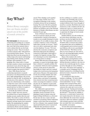 her the confidence to consider a career in science, says Nowinski, who is now a research psychologist at NASA: “Before I worked in Robert’s lab, I never thought of myself as a scientist. But Robert also never treated me as only a student in his lab—he wanted me to grow as a whole person. It was important for him that we continued to appreciate the things we loved outside the world of science.” Jennifer Fellowes ’93, who worked on her senior thesis with Remez, says the professor sets the bar high from the first day. “The expectation is that everyone should be able to research and conduct an experiment that can be published in a well-regarded, peer-reviewed journal,” says Fellowes, who is now a psychiatrist in New York City. “But there’s no fear that you won’t measure up. The sense is that we’re all doing high-quality research together, and we’re having fun.” Many of the students who work in his lab begin by meeting Remez in the classroom. He offers a lecture class each fall that introduces students to the ways we perceive the world through the five senses, as well as through our sense of balance. His course “Perception and Language” is a scientific survey of language from the listener’s perspective, everything from the physical acoustics of speech to the way we process metaphors. To conclude the class, he gives students a challenge. “It’s fun to finish out the semester with a bit of Celtic transcendentalism,” he says. “I take a passage from a poem by Yeats, and I ask them, how would you understand someone who came up to you in a bus shelter and said, ‘Turning and turning in the widening gyre/ The falcon cannot hear the falconer’?” The point, he explains, is that poetry is a tricky kind of speech that isn’t exactly directed to the listener, so we listen differently. He creates these unusual exercises to allow the students to grapple with scholarly questions and to feel that they can make their own contributions to the scientific conversation. To hone their professional abilities, Remez encourages his students to present