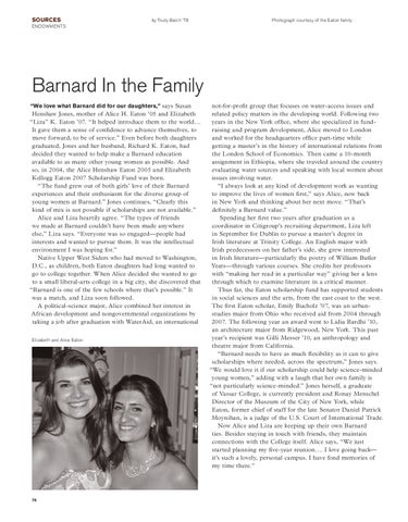 Henshaw Jones, mother of Alice H. Eaton ’05 and Elizabeth “Liza” K. Eaton ’07. “It helped introduce them to the world.... It gave them a sense of confidence to advance themselves, to move forward, to be of service.” Even before both daughters graduated, Jones and her husband, Richard K. Eaton, had decided they wanted to help make a Barnard education available to as many other young women as possible. And so, in 2004, the Alice Henshaw Eaton 2005 and Elizabeth Kellogg Eaton 2007 Scholarship Fund was born. “The fund grew out of both girls’ love of their Barnard experiences and their enthusiasm for the diverse group of young women at Barnard.” Jones continues, “Clearly this kind of mix is not possible if scholarships are not available.” Alice and Liza heartily agree. “The types of friends we made at Barnard couldn’t have been made anywhere else,” Liza says. “Everyone was so engaged—people had interests and wanted to pursue them. It was the intellectual environment I was hoping for.” Native Upper West Siders who had moved to Washington, D.C., as children, both Eaton daughters had long wanted to go to college together. When Alice decided she wanted to go to a small liberal-arts college in a big city, she discovered that “Barnard is one of the few schools where that’s possible.” It was a match, and Liza soon followed. A political-science major, Alice combined her interest in African development and nongovernmental organizations by taking a job after graduation with WaterAid, an international Elizabeth and Alice Eaton