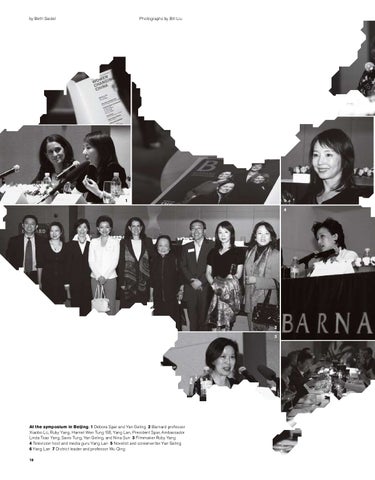 At the symposium in Beijing: 1 Debora Spar and Yan Geling 2 Barnard professor Xiaobo Lü, Ruby Yang, Harriet Wen Tung ’68, Yang Lan, President Spar, Ambassador Linda Tsao Yang, Savio Tung, Yan Geling, and Nina Sun 3 Filmmaker Ruby Yang 4 Television host and media guru Yang Lan 5 Novelist and screenwriter Yan Geling 6 Yang Lan 7 District leader and professor Wu Qing 18