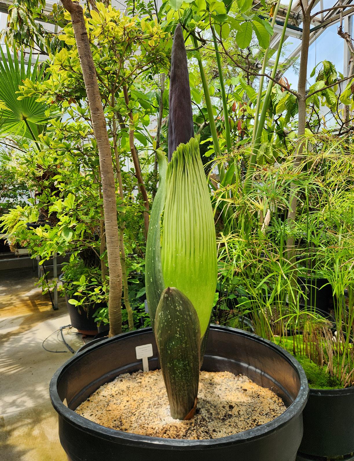 The titan arum (Amorphophallus titanum), better known as the corpse flower, is a showstopper — for both its appearance and its pungent smell. People who might not otherwise be drawn to greenhouses and botanical gardens line up to view the massive plant, which often surpasses 6 feet tall and 4 feet in diameter. The stinky bud that bloomed this summer at Barnard’s Arthur Ross Greenhouse attracts similar fanfare. Prior to the flower’s opening, greenhouse director Nick Gershberg power-washed the floors, installed livestream cameras, and readied the flower for the oncoming onslaught. It takes the plant 10 years to reach reproductive maturity before blossoming every two years. The first time the flower opened was during the pandemic, leaving only Gershberg to appreciate its majesty in person. This year, dozens of visitors passed through. In the days leading up to the big event, Gershberg stood admiring a less celebrated moment of the flower’s life span — just before it opened. “It goes from giving some futuristic deco vibes and then the ribbing is like a neoclassical Victorian scarab beetle kind of thing — but really it’s stunning at every stage,” he says. —Tom Stoelker
