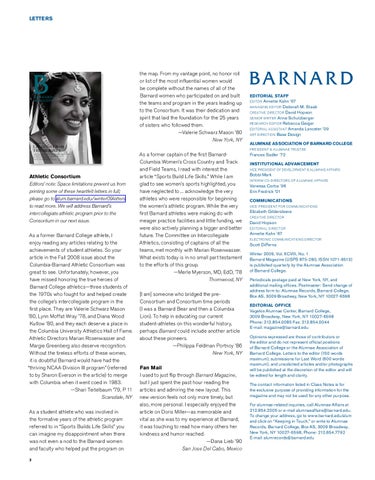the map. From my vantage point, no honor roll or list of the most influential women would be complete without the names of all of the Barnard women who participated on and built the teams and program in the years leading up to the Consortium. It was their dedication and spirit that laid the foundation for the 25 years of sisters who followed them. —Valerie Schwarz Mason ’80 New York, NY As a former captain of the first BarnardColumbia Women’s Cross Country and Track and Field Teams, I read with interest the article “Sports Build Life Skills.” While I am glad to see women’s sports highlighted, you have neglected to ... acknowledge the very athletes who were responsible for beginning the women’s athletic program. While the very first Barnard athletes were making do with meager practice facilities and little funding, we were also actively planning a bigger and better future. The Committee on Intercollegiate Athletics, consisting of captains of all the teams, met monthly with Marian Rosenwasser. What exists today is in no small part testament to the efforts of this group. —Merle Myerson, MD, EdD, ’78 Thornwood, NY [I am] someone who bridged the preConsortium and Consortium time periods (I was a Barnard Bear and then a Columbia Lion). To help in educating our current student-athletes on this wonderful history, perhaps Barnard could include another article about these pioneers. —Philippa Feldman Portnoy ’86 New York, NY Fan Mail I used to just flip through Barnard Magazine, but I just spent the past hour reading the articles and admiring the new layout. This new version feels not only more timely, but also, more personal. I especially enjoyed the article on Doris Miller—as memorable and vital as she was to my experience at Barnard, it was touching to read how many others her kindness and humor reached. —Dana Lieb ’90 San Jose Del Cabo, Mexico