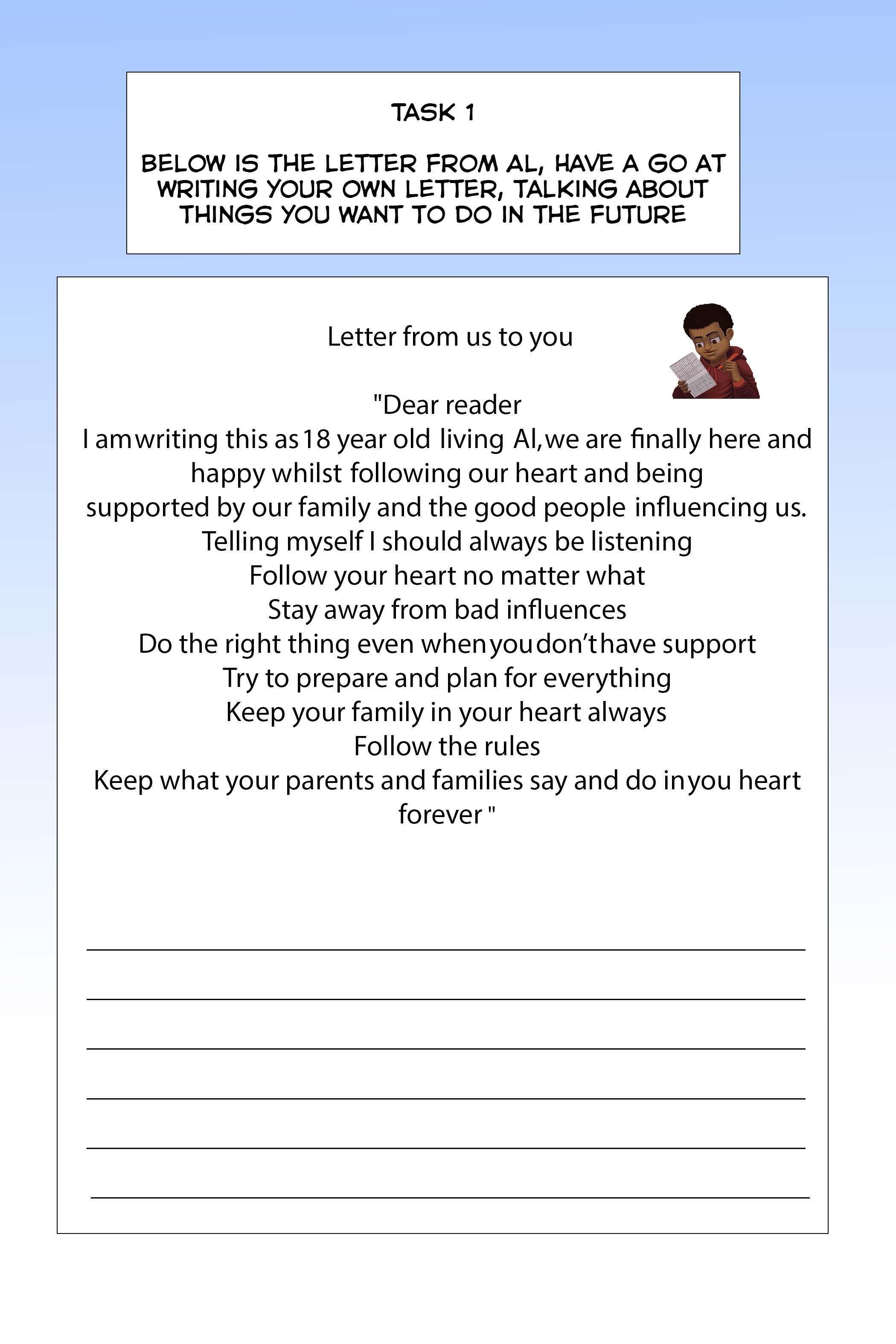 The idea for this comic book came from of a group of children and young people with experience of seeking safety in the UK as part of a Barnardo’s Care Journeys programme called Triangles. The young people wanted to make sure that you know that you are not alone and to help you in difficult times.
