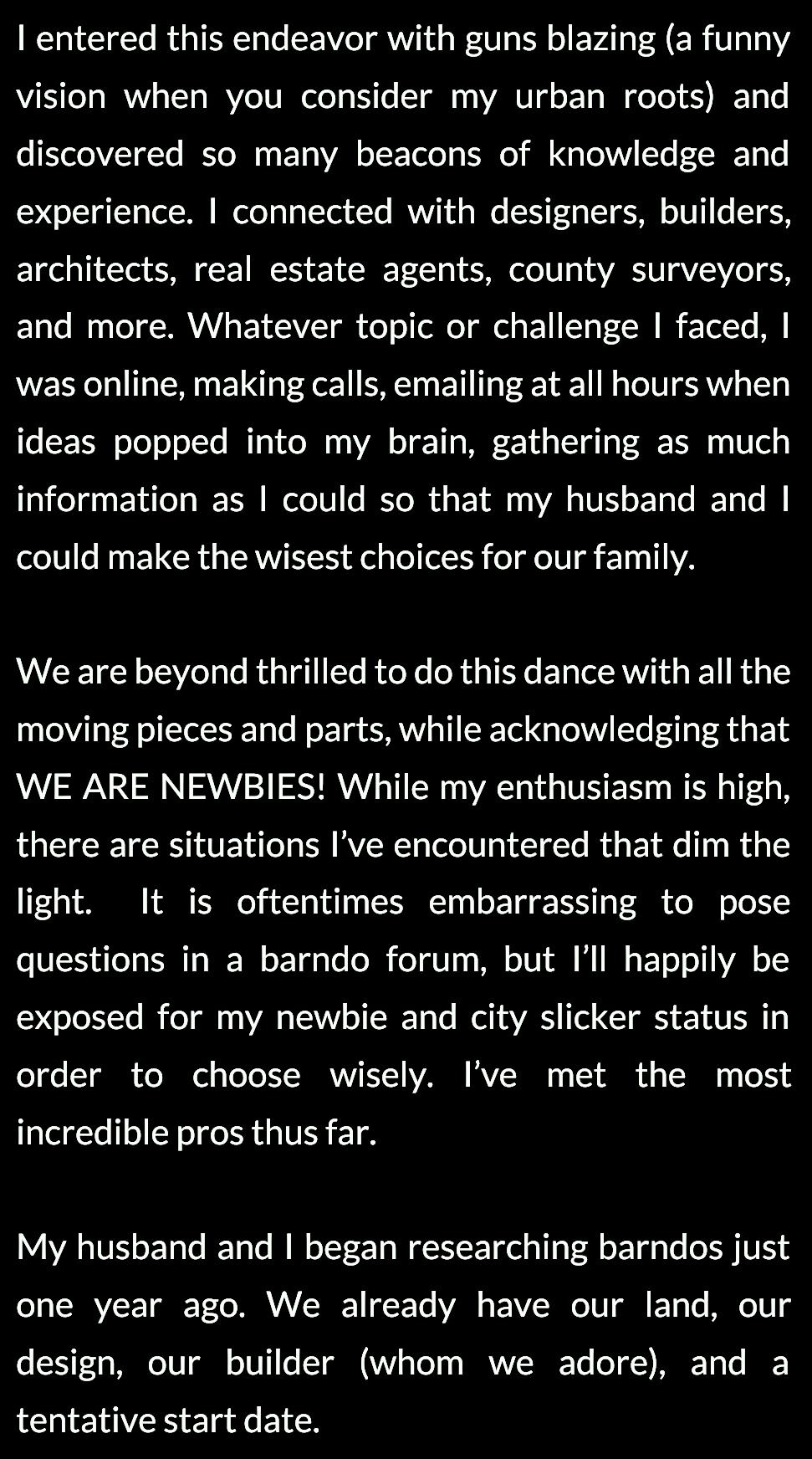 These questions may have been what most of us here were faced with and answered with immense positivity and readiness to move forward. Excitement is extreme and the possibilities endless. The community is large and the resources deep. Welcome to the barndominium world, ladies and gentlemen!