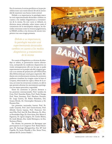 Debido a su importancia, la patología macular está experimentando destacados cambios en cuanto a los medios diagnósticos y tratamientos de la misma En cuanto al diagnóstico y a técnicas de abordaje se refiere, se presentaron nuevas alternativas, incluyendo los modernos dispositivos en visión intraoperatoria 3D, con los que se pudo experimentar en la propia sala del congreso gracias a un sistema de proyección 3D UHD (Ultra Alta Definición) que causó gran impresión. Mediante este revolucionario sistema, los asistentes pudieron visualizar las cirugías como lo hace el cirujano, observando las capas y fibras de la retina, así como las estructuras oculares, en 3D, lo que permite afrontar los movimientos quirúrgicos con mayor precisión y seguridad. Entre los asistentes es preciso destacar a los ponentes internacionales: Prof. Lyndon da Cruz, Prof. Stanislao Rizzo, Prof. Paulo Stanga, Prof. Peter Szurman, Prof. Eberhart Zrenner, Dr. Luigi Caretti, Dr. Robin Hamilton, Dra. Grazia Pertile, Dr. Christopher Riemann y Dr. Kanmin Xue. Los ponentes nacionales fueron: Prof. Ricardo Casaroli, Prof. José García-Arumí, Prof. Alfredo García Layana, Prof. Francisco Gómez-Ulla, Prof. José M. Ruiz Moreno, Dr. Álvaro Fernández-Vega, Dr. Lluis Arias, Dra. Marta S. Figueroa, Dr. Ignasi Jürgens, Dr. Carlos Mateo, Dr. Jordi Monés, Dra. Isabel Relimpio y la Dra. Verónica Pilotti. Por último, los ponentes de Barraquer que participaron en el congreso: Prof. Rafael Barraquer, Dr. Santiago Abengoechea, Dra. Mª José Capella, Dr. Javier Elizalde y Dra. Sònia Viver, además del Dr. Jeroni Nadal. • BARRAQUER • AÑO 2016 • NÚM. 26