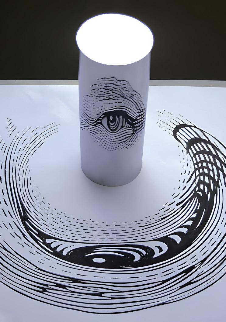 ← Fig.1 Szem (Ull), anamorfosi per reflexió cilíndrica, obra de l’hongarès István Orosz.
