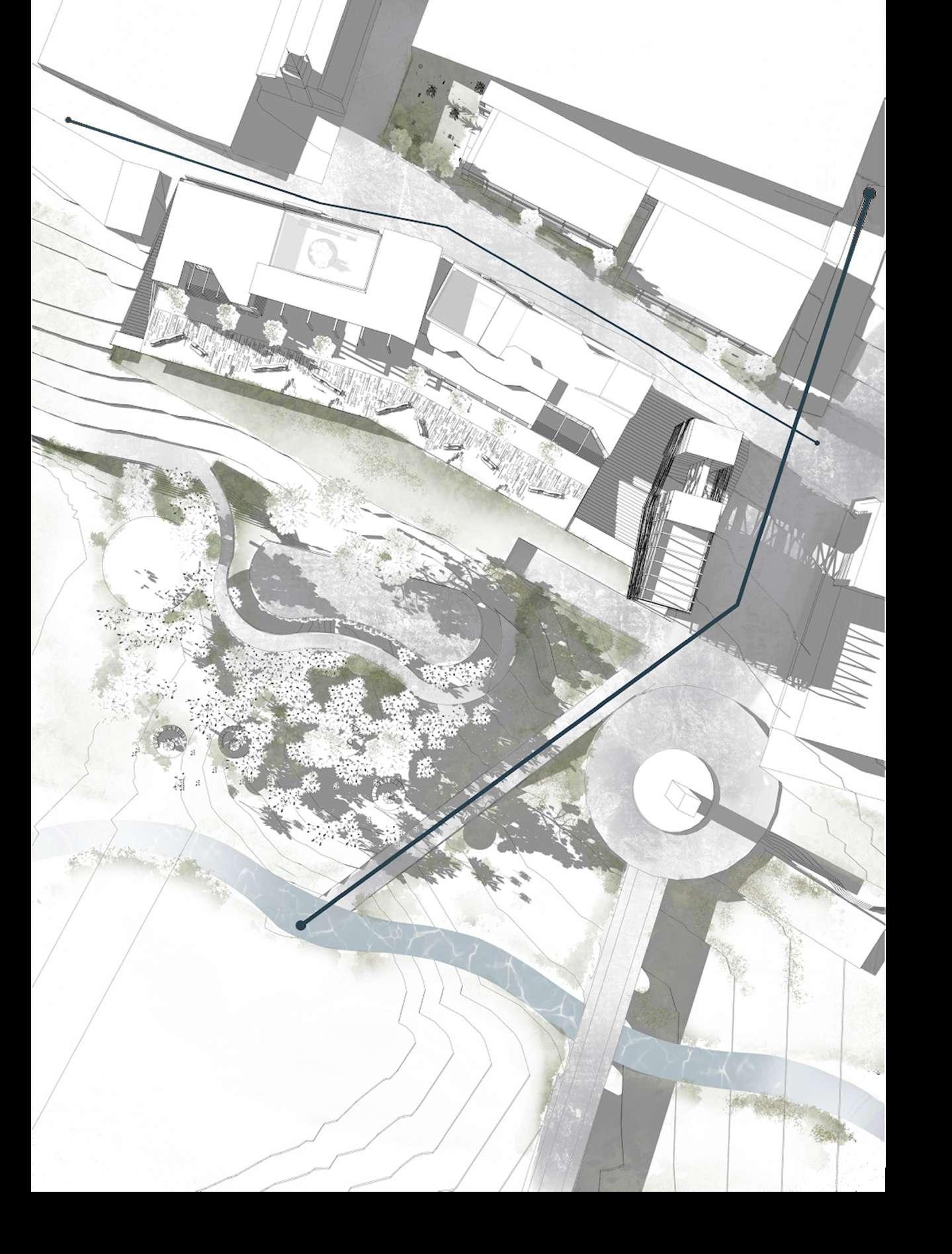 Through a series of studies the pavillion and its site plan was made based on the flow of users and the preexistant vegetation.