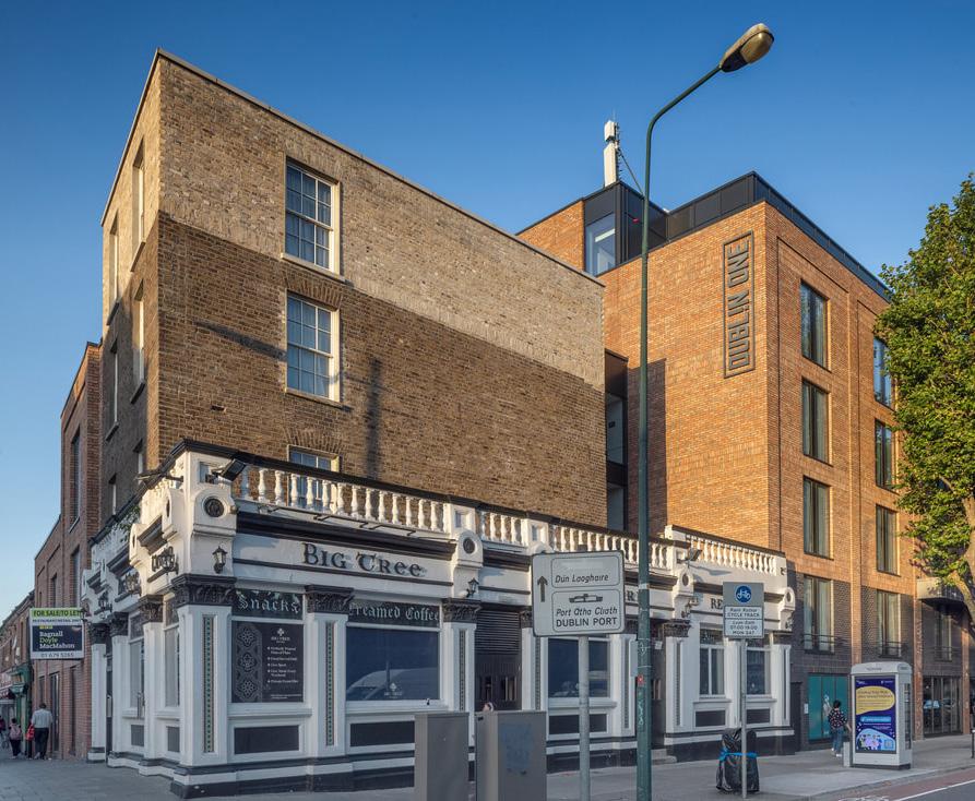 The Dublin One Hotel was opened in 2021. The project involved the restoration of The Big Tree pub which has opened separately to the hotel. The hotel draws on the character of the surrounding historical buildings. It adopts similar materials and window proportions. All windows are vertically proportioned. It is marked out as a modern public building in the adoption of curtain walling for the stairs and setback top storey. The regular layout of hotel rooms has facilitated the breaking up of the long elevation on to North Circular Road into bays. The vertical window proportions and bay width reflect the traditional fine grain development of Dublin. The scale of the building has been further sub-divided vertically by the introduction of a canopy at second floor level and the change of brick colour for the ground and first floor within the bays. This relates directly to the adjoining two storey development.