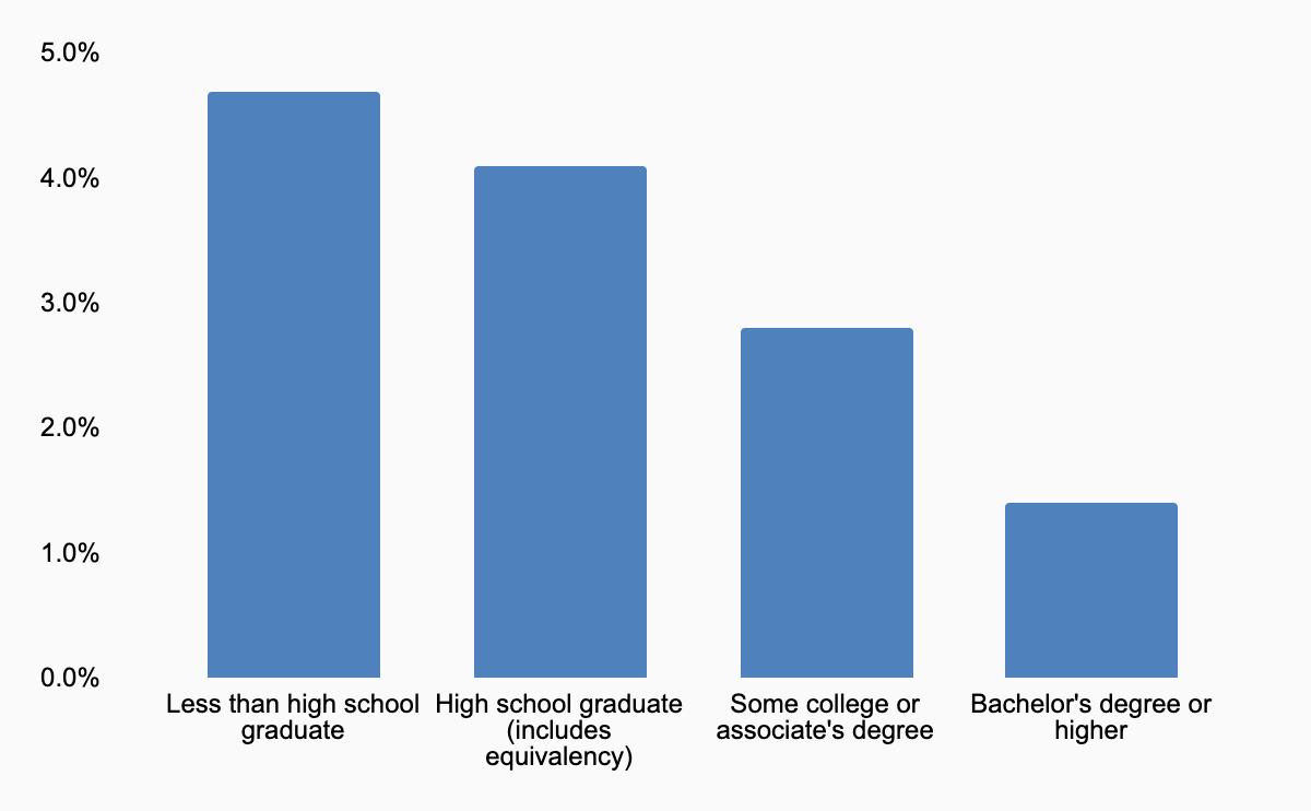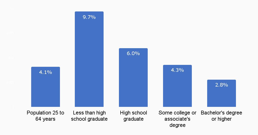 The unemployment rate in 2020 for individuals 25 to 64 years and older was 4.6 percent. However, for those who attained less than a high school diploma or earned a high school diploma, the rate is disproportionately higher at 8.2 percent and 6.2 percent, respectively. Unemployment rates among residents with a bachelor’s or higher is significantly lower than the Providence metro unemployed population at 2.6 percent (Figure 3).
