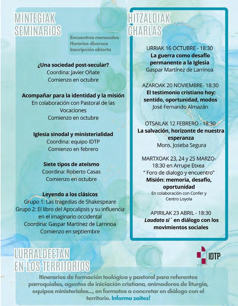 El Instituto Diocesano de Teología y Pastoral inauguró el curso 25-26 el 23 de septiembre. El acto inaugural contó con la teóloga María José Arana, quien presentó su último libro: “La espiritualidad de María Magdalena, vivida por las mujeres”. La teóloga presentó la publicación que busca recuperar la figura de la Magdalena como líder y predicadora, liberándola del estereotipo de pecadora arrepentida. Una invitación a mirarnos en el espejo de la primera testigo de la Resurrección.