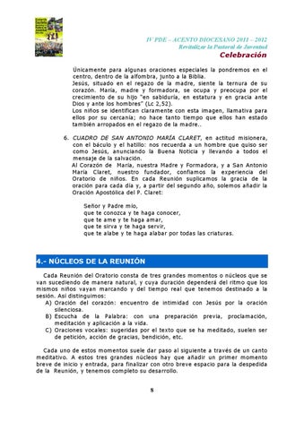 Celebración Únicamente para algunas oraciones especiales la pondremos en el centro, dentro de la alfombra, junto a la Biblia. Jesús, situado en el regazo de la madre, siente la ternura de su corazón. María, madre y formadora, se ocupa y preocupa por el crecimiento de su hijo “en sabiduría, en estatura y en gracia ante Dios y ante los hombres” (Lc 2,52). Los niños se identifican claramente con esta imagen, llamativa para ellos por su cercanía; no hace tanto tiempo que ellos han estado también arropados en el regazo de la madre.. 6. CUADRO DE SAN ANTONIO MARÍA CLARET, en actitud misionera, con el báculo y el hatillo: nos recuerda a un hombre que quiso ser como Jesús, anunciando la Buena Noticia y llevando a todos el mensaje de la salvación. Al Corazón de María, nuestra Madre y Formadora, y a San Antonio María Claret, nuestro fundador, confiamos la experiencia del Oratorio de niños. En cada Reunión suplicamos la gracia de la oración para cada día y, a partir del segundo año, solemos añadir la Oración Apostólica del P. Claret: Señor y Padre mío, que te conozca y te haga conocer, que te ame y te haga amar, que te sirva y te haga servir, que te alabe y te haga alabar por todas las criaturas.
