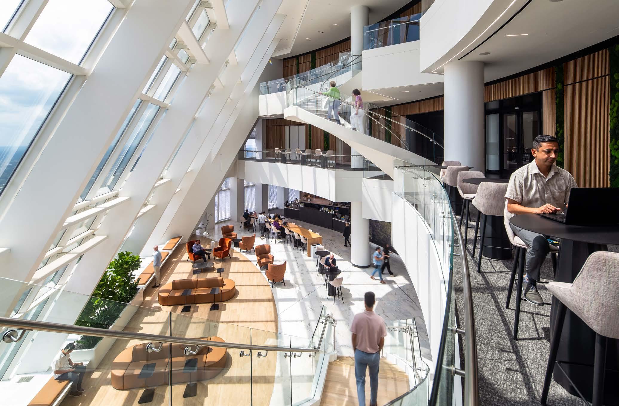 This Wells Fargo’s office space emphasizes an employee-centered approach with a range of features designed to boost well-being and engagement. Highlights include a 20,000-square-foot Food Hall and an upgraded rooftop terrace, both of which enhance the overall work experience. Flexible workspaces infused with biophilic elements contribute to a healthier and more stimulating environment. Advanced sustainability measures are integrated throughout, aligning with Wells Fargo’s commitment to efficiency and long-term employee satisfaction.