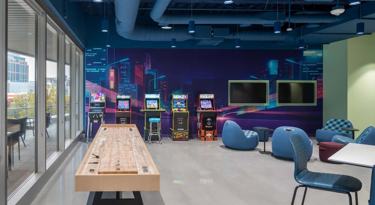 Every element of Armstrong’s new space, from location to unique offerings, was designed to emulate an energetic work environment with the goal of attracting and retaining talent. A large break area serves as a place for gatherings, open workspaces encourage collaboration, and an employee game room encourages camaraderie. A large boardroom, private offices, and conference rooms add flexibility to the work environment.