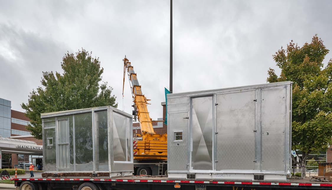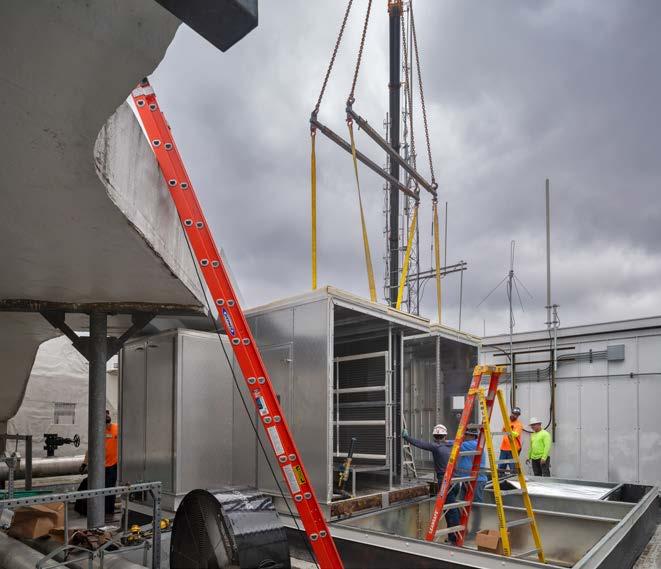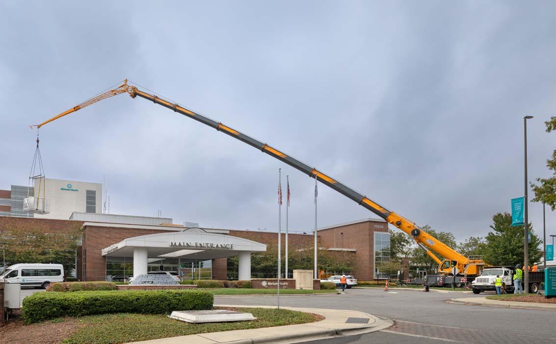 Executing this project required precise coordination and structural modifications. Crews saw-cut the existing framework to create new duct drops—one above the mechanical space and another directly over the busy nurses’ station. To minimize disruption, the project team occupied another nurses’ station for a week, carefully removing the ACT ceiling, modifying the structure, routing new ductwork, and restoring the ceiling upon completion. A 275-ton mobile crane was brought in for the lift, stationed at the facility’s main entrance during a planned Saturday shutdown. LOCATION Charlotte,