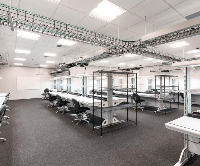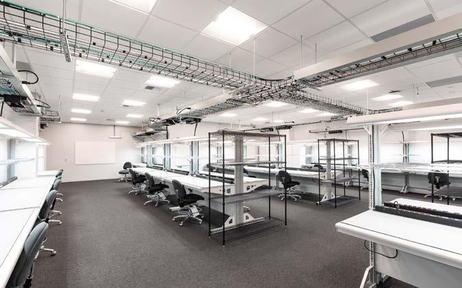 The server labs were designed with a hot aisle and a cold aisle to contain the airflow and prevent the racks from overheating. This method is a more efficient means of cooling than other methods. The busway used allows for flexibility to “hot swap” or change electrical components depending on the requirements needed. In the bench labs, electrostatic discharge carpet and copper were installed to ground the flooring and prevent damage to equipment.