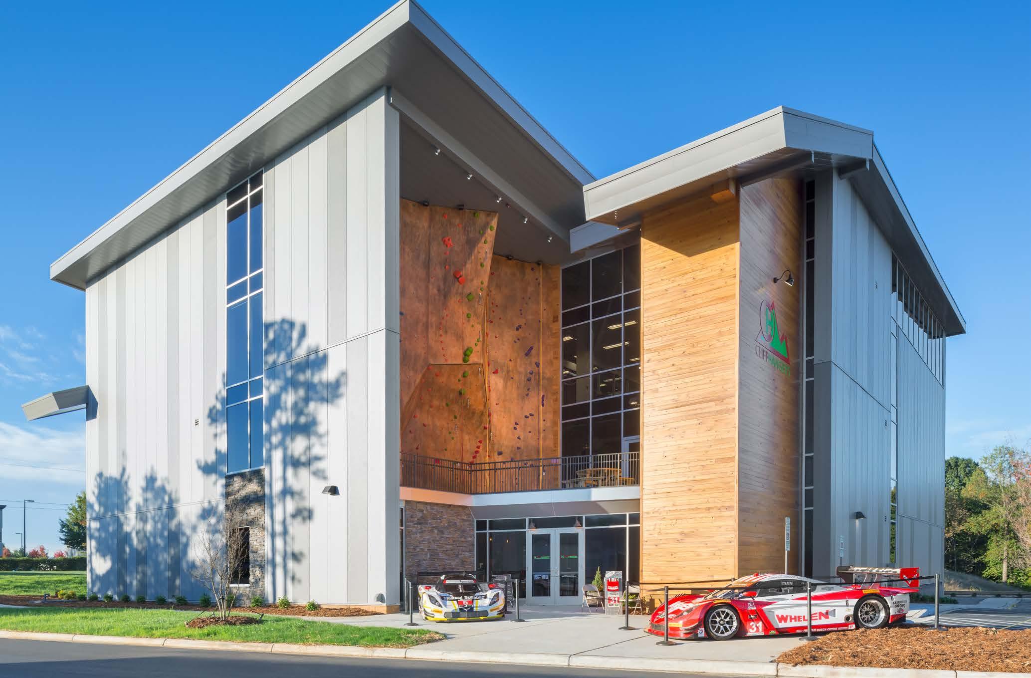 Cliff Hangers contains North Carolina’s only indoor 15-meter competition speed wall. The construction required excavation and building below grade to accommodate the 50-foot wall while staying within zoning height limitations.
