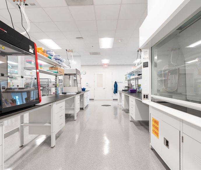 Designed to house human diseases that pose a moderate health hazard, the lab’s BSL-2 status required the addition of enhanced safety measures and requirements such as biological safety cabinets, proper hazardous material disposal equipment, hand and eye washing stations, and self-closing, lockable access doors. A generator was added to back up the lab’s equipment and freezers in the event of a power outage, and electrical upgrades were implemented in the lab, including the addition of power in ceiling panels and perimeter walls.