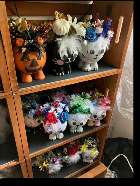 I have flowerpots with faces of all kinds; hand painted with floral arrangements. Some of the pots are pottery with silk flowers and some with actual greens. I also have flowers, plants and Mason jars – painted with Floral arrangements. I also produce yard art made with glass bowls, dishes cups, etc. Mostly everything is made from recycled materials –Saving the environment. I am an elementary teacher for over 30 years. I create things out of ordinary items used in households, saving the environment as you might say. What I createissomewhatunusualandoftenunique.