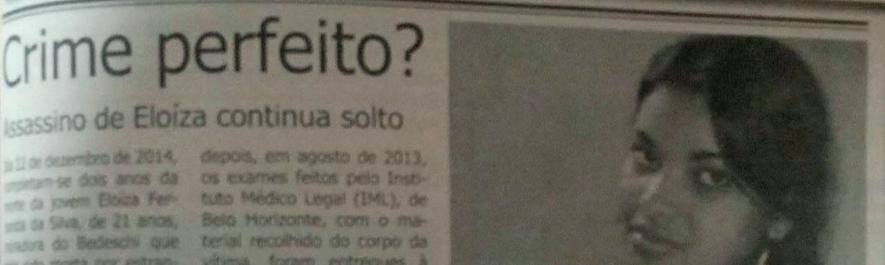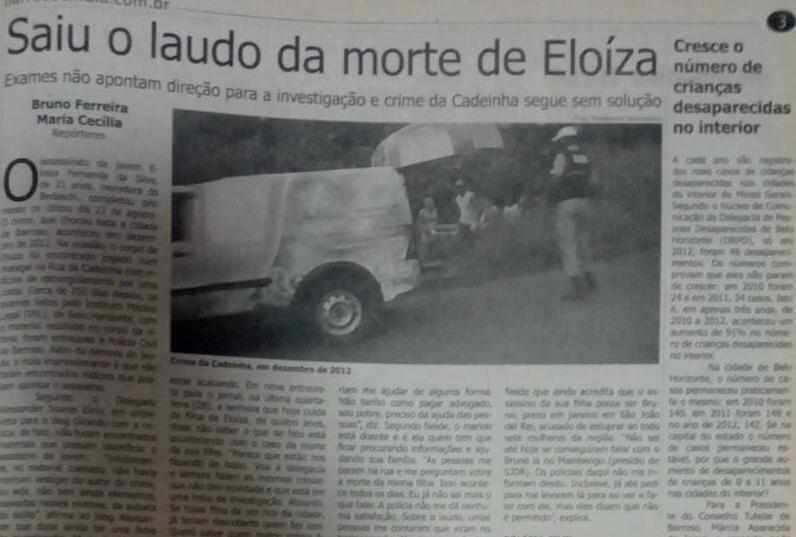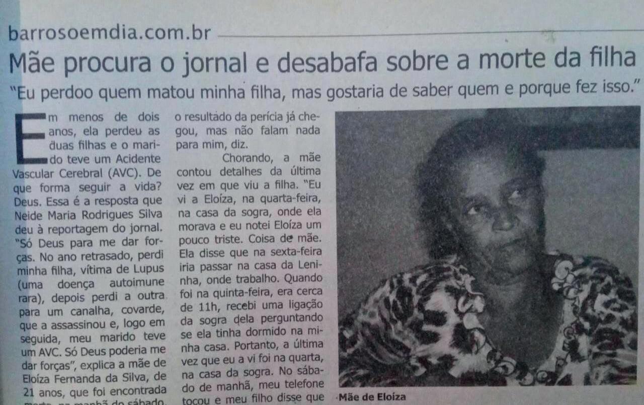 roso, declarou que sobre o caso, ele não teria conhecimento, pois chegou na cidade em janeiro de 2019, ou seja, sete anos depois do ocorrido. “Posso pedir informações aos investigadores”, sugeriu Roberto com o intuito de colaborar com a matéria do barrosoemdia. Porém, até o fechamento desta edição - quarta-feira (7) 12h - nenhuma nova informação havia sido repassada ao meio de comunicação. Entre outras dezenas de perguntas que poderiam ser feitas, fica a falta de informação no que diz respeito ao inquérito policial. Não foi possível apurar também se ainda existe investigação em curso e se tem alguma novidade sobre o Crime da Cadeinha, que chocou a cidade e colocou a população em estado de alerta. “Vocês já pararam para pensar uma coisa: o assassino da Eloíza está por aí, andando entre nossas filhas, sobrinhas, netas... Há qualquer momento ele pode agir novamente e tirar a vida de mais uma pessoa inocente. Não temos que esperar acontecer com nossos filhos para indignarmos, porque a próxima vítima pode ser nossos filhos.