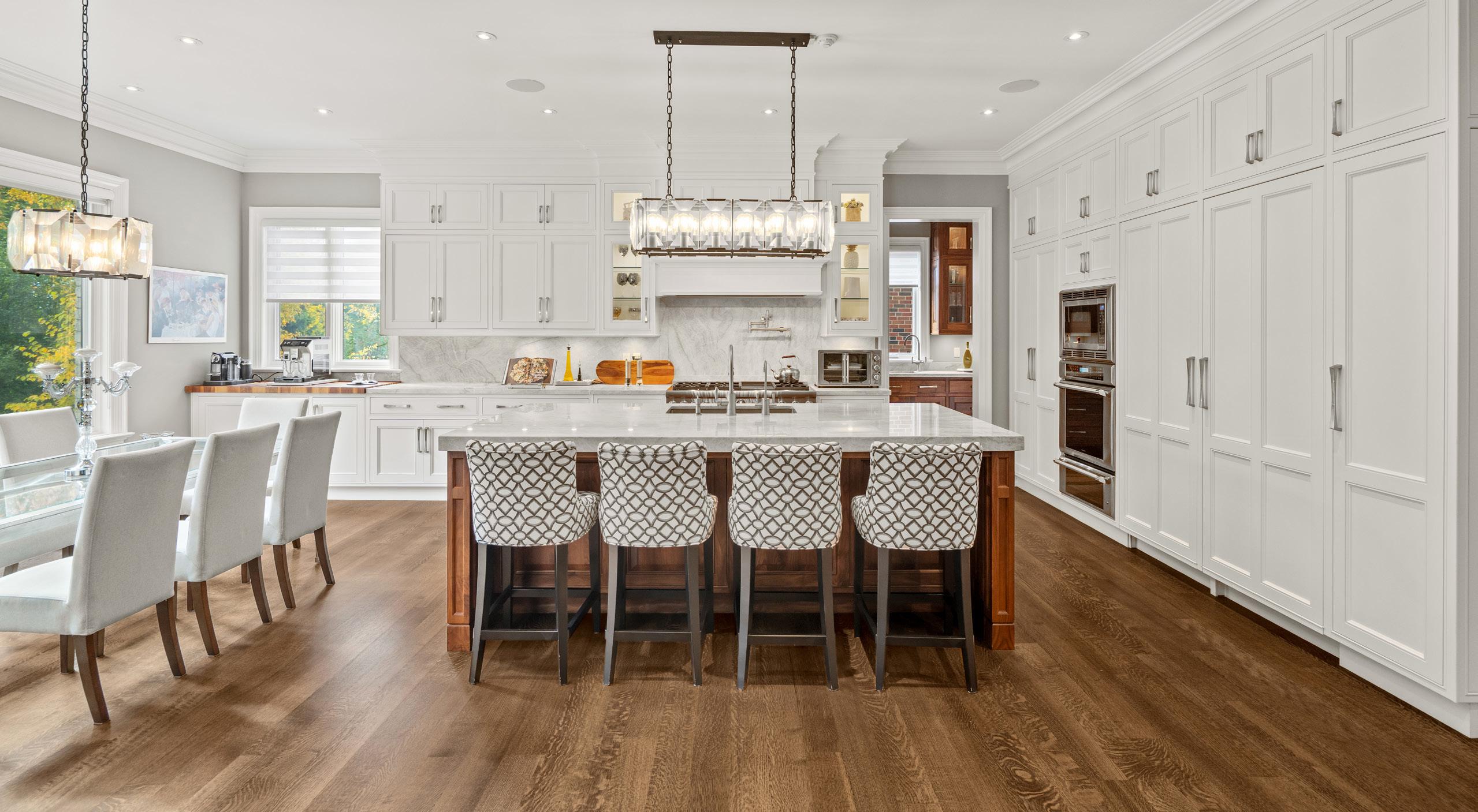 The Chef’s Kitchen, accessed by archways leading from the Family Room and the Main Hall plus Servery, features white oak rift hardwood floor, crown moulding, pot lights, pendant lights, undervalance lighting, integrated speakers, framed custom dovetailed cabinetry throughout including large walnut centre island with Quartzite counters and backsplash, butcher block counter, kicksweep, pot filler, instant hot water filler, double stainless steel sink with Rubinet retractable faucet and garburator, Breakfast Area with hanging chandelier and windows overlooking the Rear Garden plus walkout to the terrace and glass break sensor