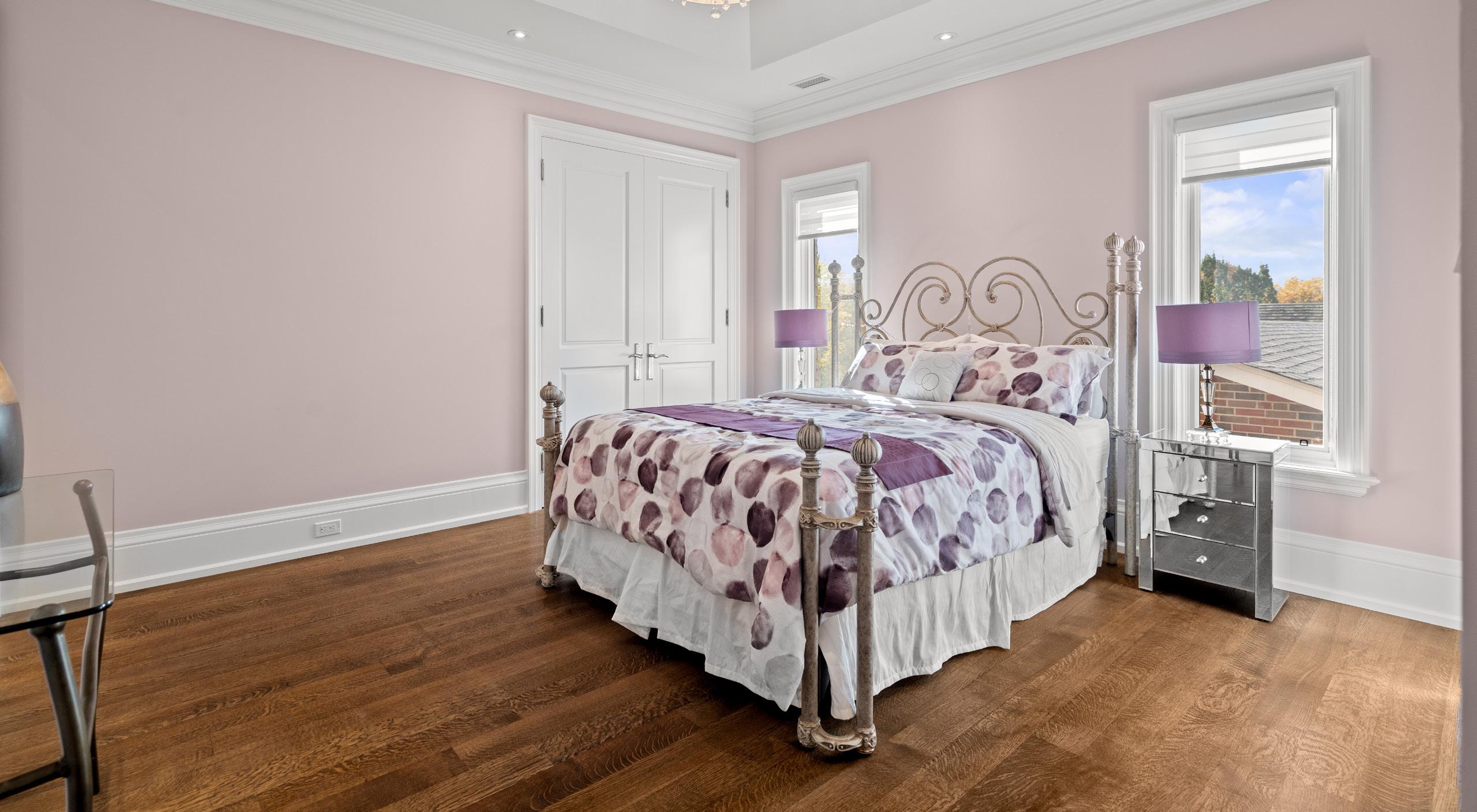 The 2nd Bedroom features vaulted ceiling, white oak rift hardwood floor, pot lights, hanging chandelier, two double closets with custom organizers, window overlooking the front garden, and a 4-Piece Ensuite.