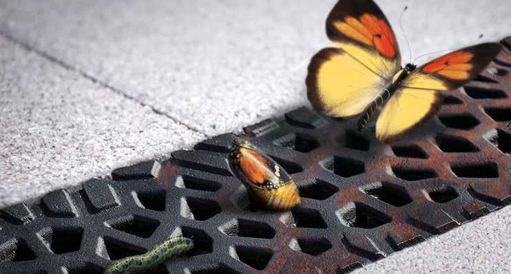 La fonte présente initialement une couleur grisnoir, mais sa surface s’oxyde après un certain temps, surtout aux endroits sur où lesquels les véhicules ne roulent pas. L’oxydation est un processus de protection normal, qui donne à la grille un aspect rouillé authentique et naturel.
