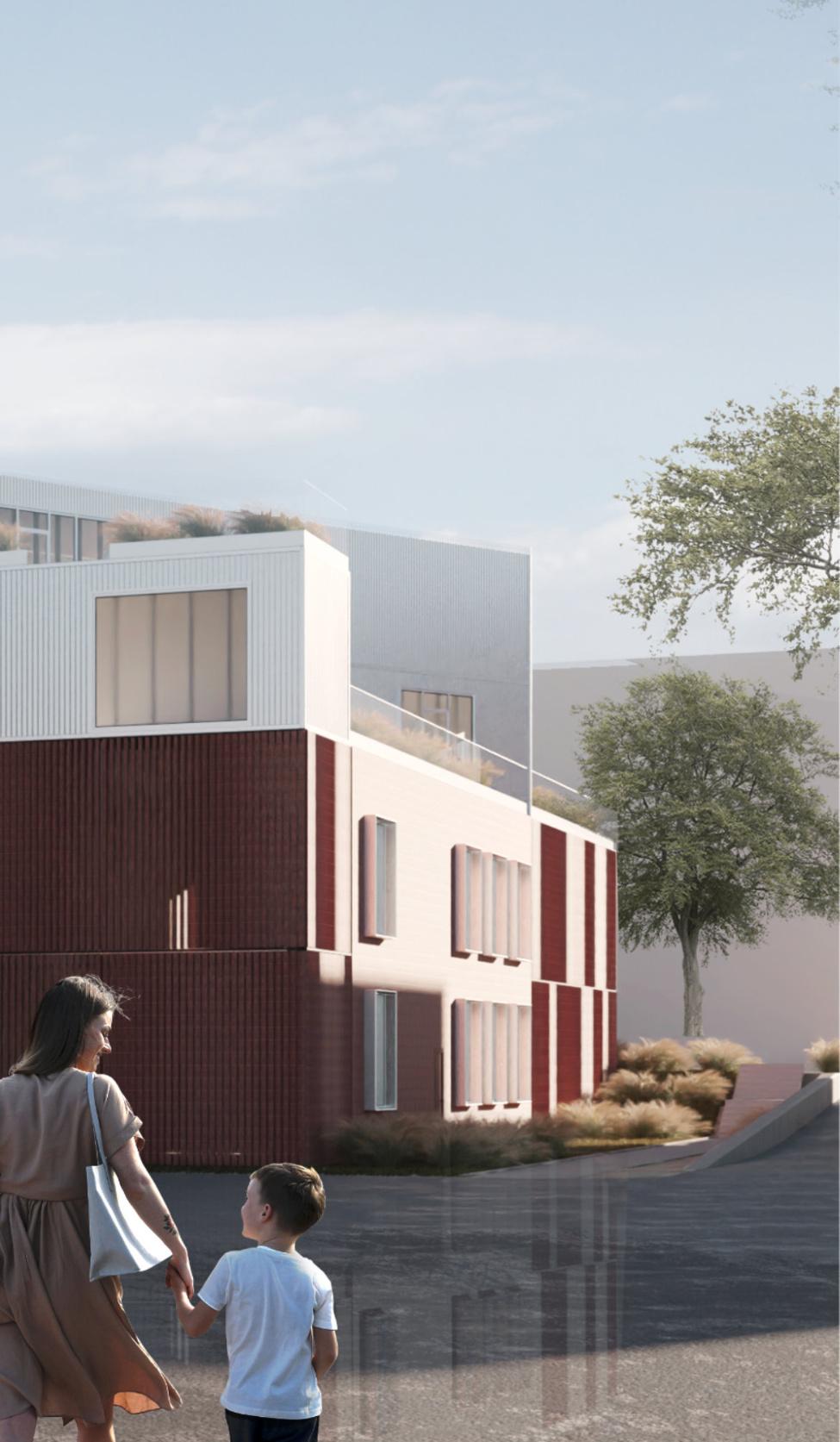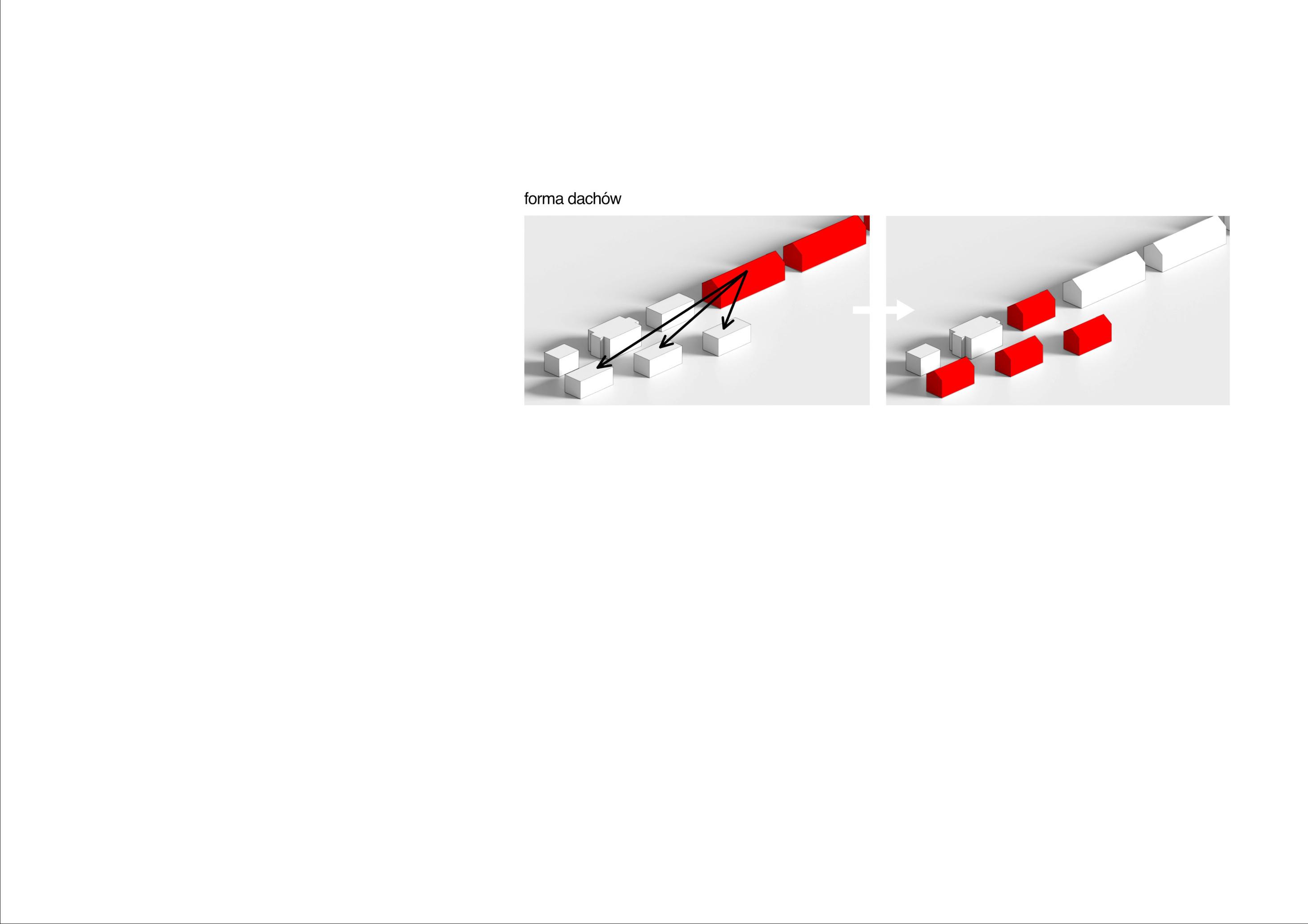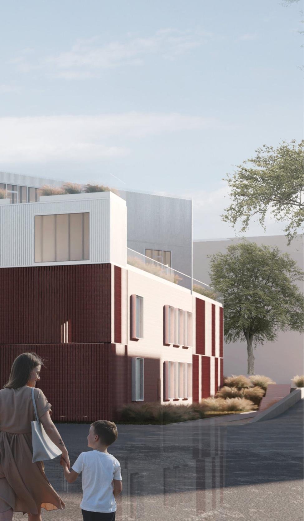 Formabudynkuinspirowanajestnowoczesnymmieszkalnictwem socjalnymorazwpisujesięwotaczającyjąkontekstarchitektoniczny. Bryłębudynkutworzytradycyjnakubaturazdwuspadowymdachem, nawiązującdodachówzabudowysąsiadującejzobszaremopracowania. Odstronypołudniowejzostałaulokowanastrefadziennamieszkań,wraz zszerokimitarasamibędącymiczęściąbryły.Otwierająsię onenazielone podwórko,cododatkowopozytywniewpływanajegobezpieczeństwo, oraznasąsiadującezdziałkąodpołudniaterenyzieleni.