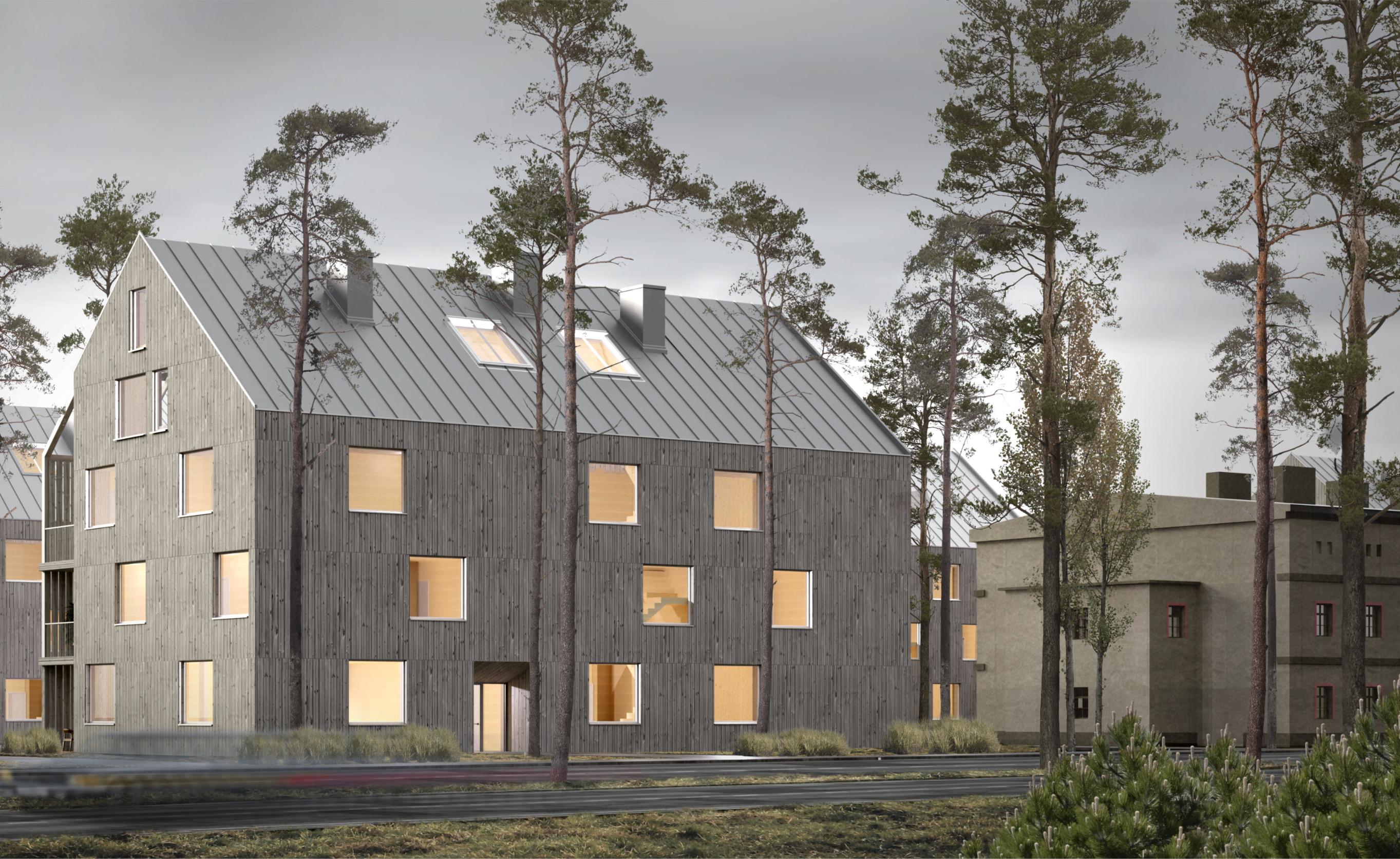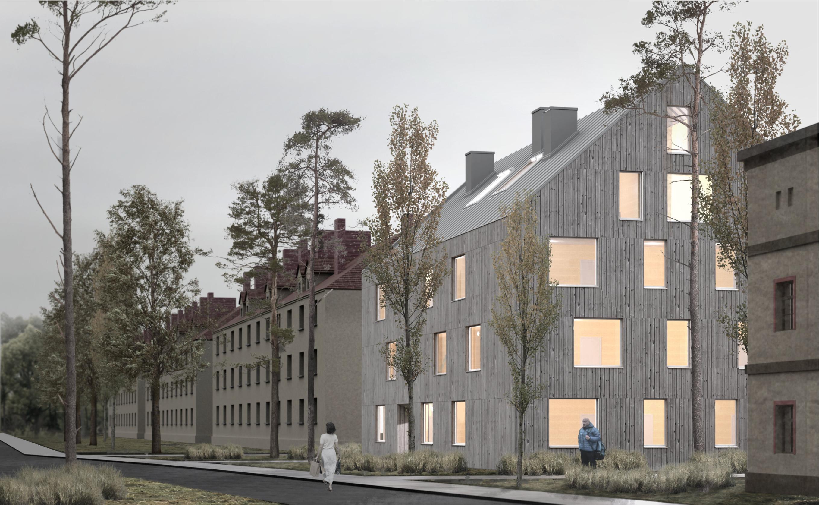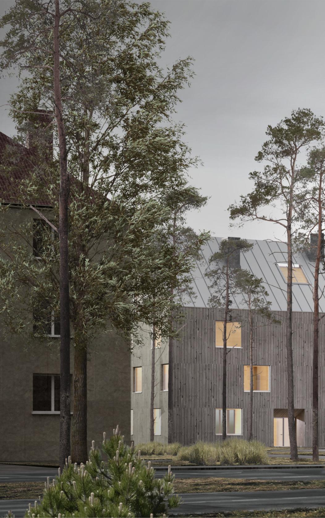 Formabudynkuinspirowanajestnowoczesnymmieszkalnictwem socjalnymorazwpisujesięwotaczającyjąkontekstarchitektoniczny. Bryłębudynkutworzytradycyjnakubaturazdwuspadowymdachem, nawiązującdodachówzabudowysąsiadującejzobszaremopracowania. Odstronypołudniowejzostałaulokowanastrefadziennamieszkań,wraz zszerokimitarasamibędącymiczęściąbryły.Otwierająsię onenazielone podwórko,cododatkowopozytywniewpływanajegobezpieczeństwo, oraznasąsiadującezdziałkąodpołudniaterenyzieleni.