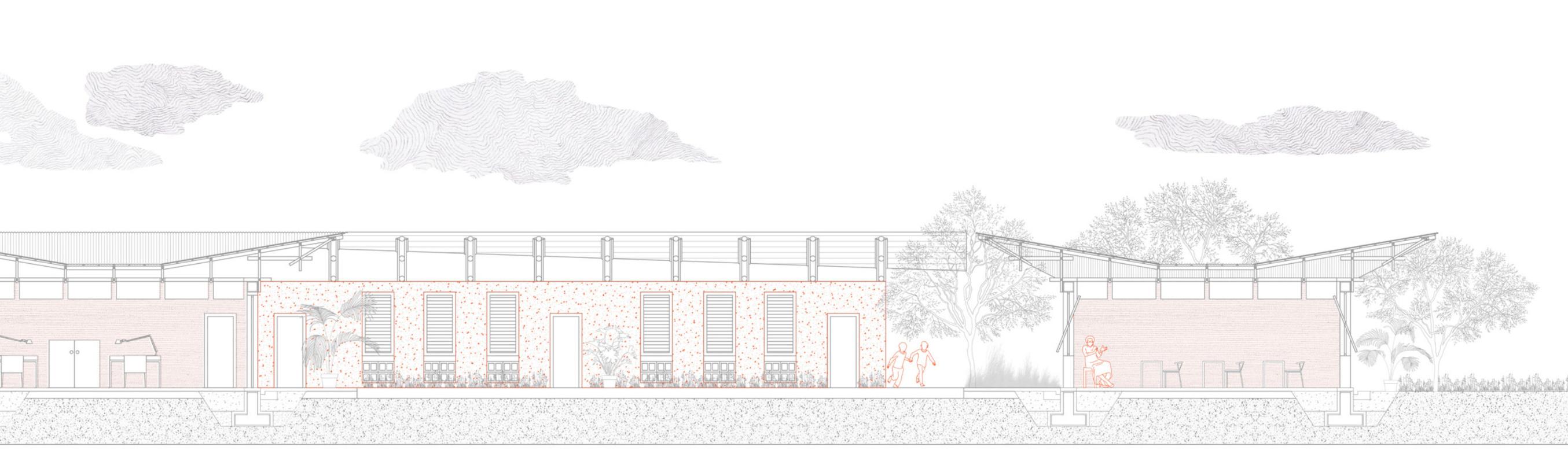 Szkołaskłądasięzczterechmodułów orazposiadaczteryoddzielnedachy. Każdyznichzostałzaprojektowanyw takisposób,abypodczasopadów kierowaćwodędodwóch wyznaczonychstrefbudynku.Strefyte, przekształconewbujneoazy,pełnią różnefunkcje,wtymjadalni,stołówki orazstrefyrelaksacyjnejprzylegającej dopokojupacjenta.Kierowanadonich wodanawadniarośliny,używanaSale lekcyjneotaczajągłównyplac,astrefa dlanauczycieliisalaspotkańznajdują sięwpobliżugłównegowejścia.Dwie strefywypoczynkowesąusytuowanepo przekątnejnaprzeciwległychkrańcach budynku,wlustrzanymodbiciudwóch wejść.Tocelowerozmieszczenie sprzyjapoczuciuotwartości,pozwalając użytkownikomnawchodzeniei wychodzeniepraktyczniezkażdej strony,jednocześniebudującpoczucie bezpieczeństwadziękirozmieszczeniu kluczowychfunkcjiwokółcentralnego placuwewnątrzkompleksu. Wewnętrznyplaczapewnia elastycznośćfunkcjonalną,oferując przestrzeńnaróżnewydarzenia organizowaneprzezlokalną społeczność,cojeszczebardziej wzmacniawięźmiędzyszkołąajej otoczeniem.