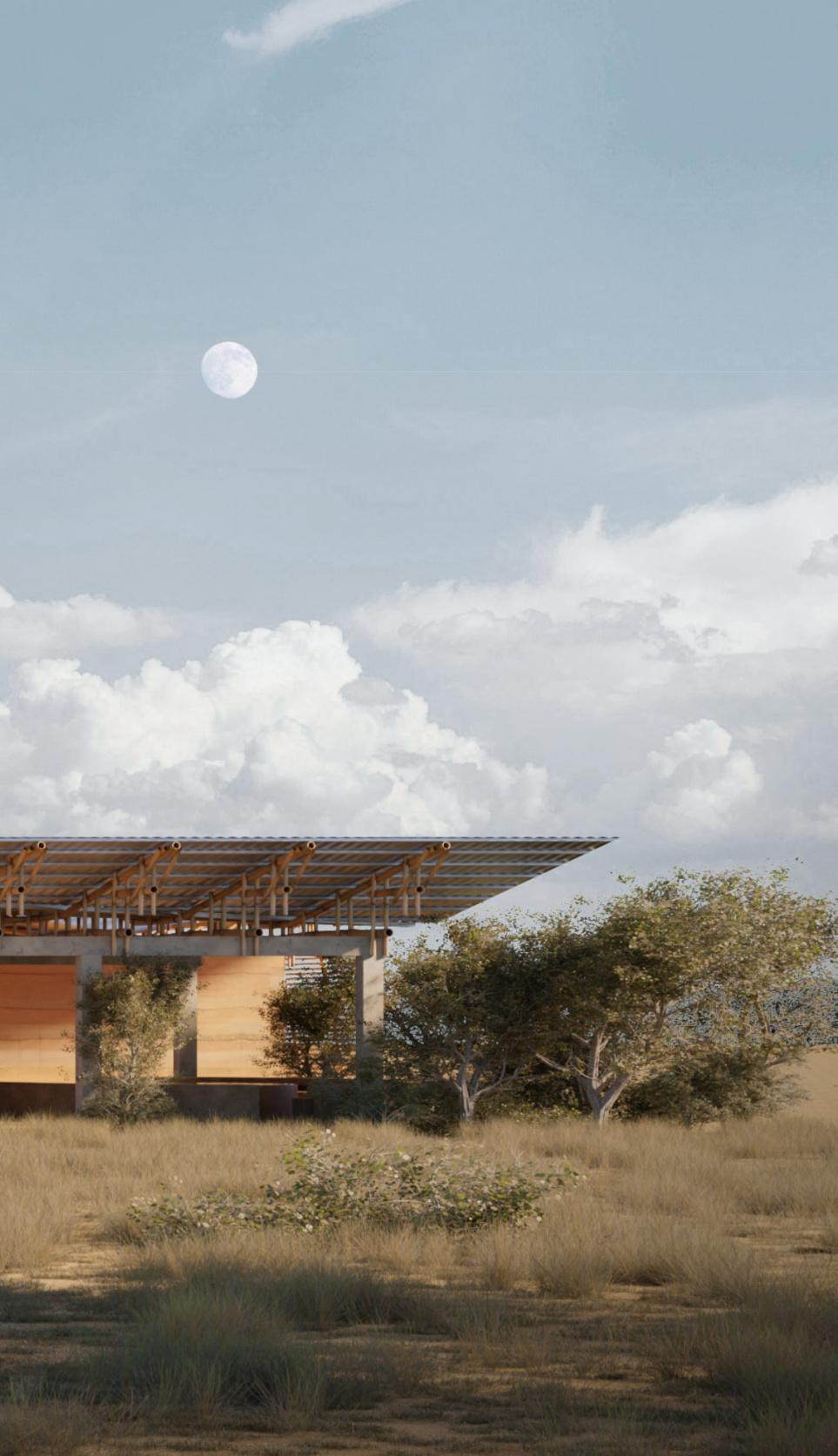 5.dachyzbierające wodędeszczową Podjęliśmyzadaniestworzeniaszkoły,którawpełni zaspokoipodstawowepotrzebylokalnejspołeczności, jednocześnierealizującideęsamowystarczalności.Projekt czerpieinspiracjęzprzykładówafrykańskiejarchitektury tradycyjnejjakijejnowoczesnychodmian,natomiast dynamicznydachmanacelużytkowyjakiestetyczny.