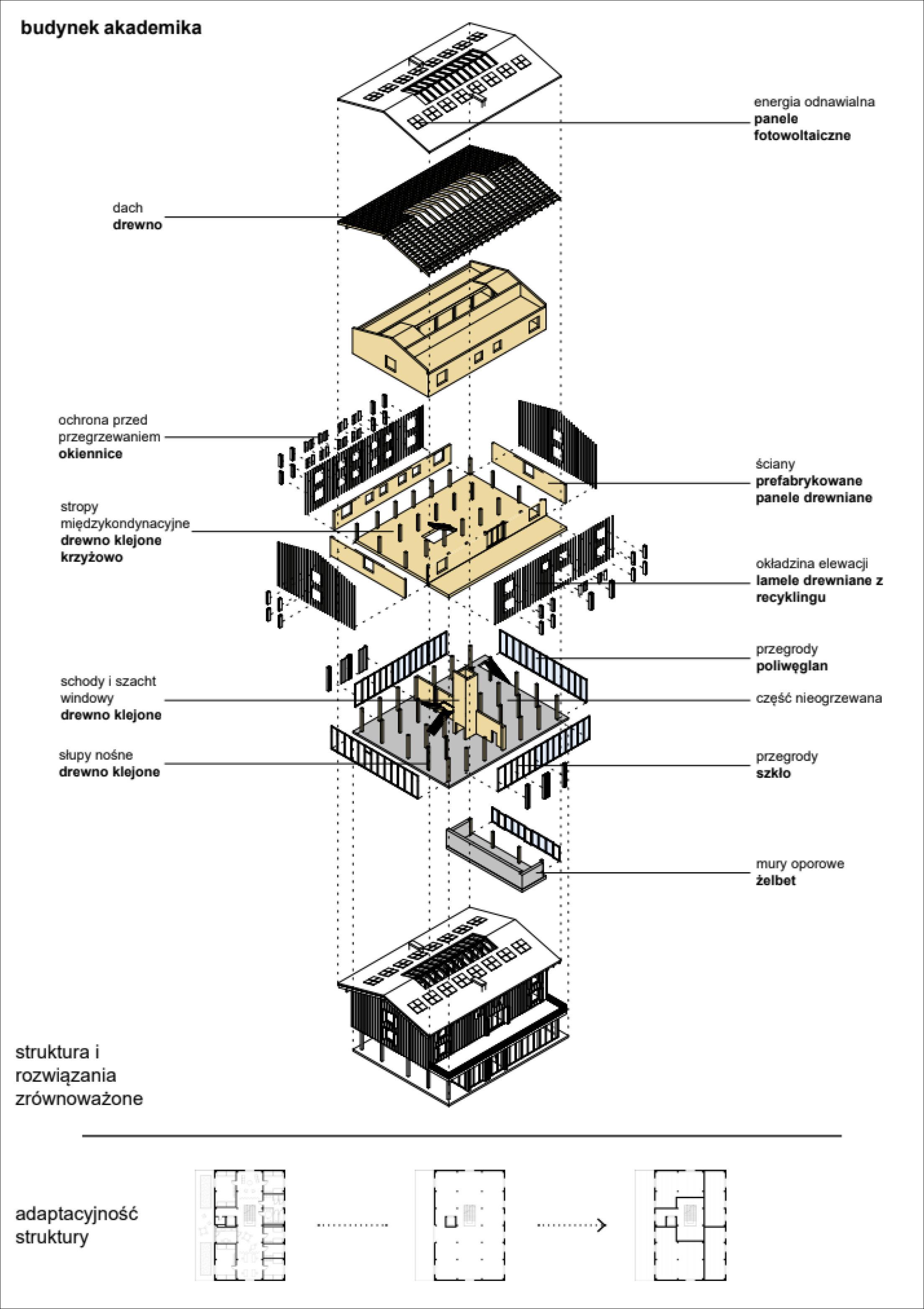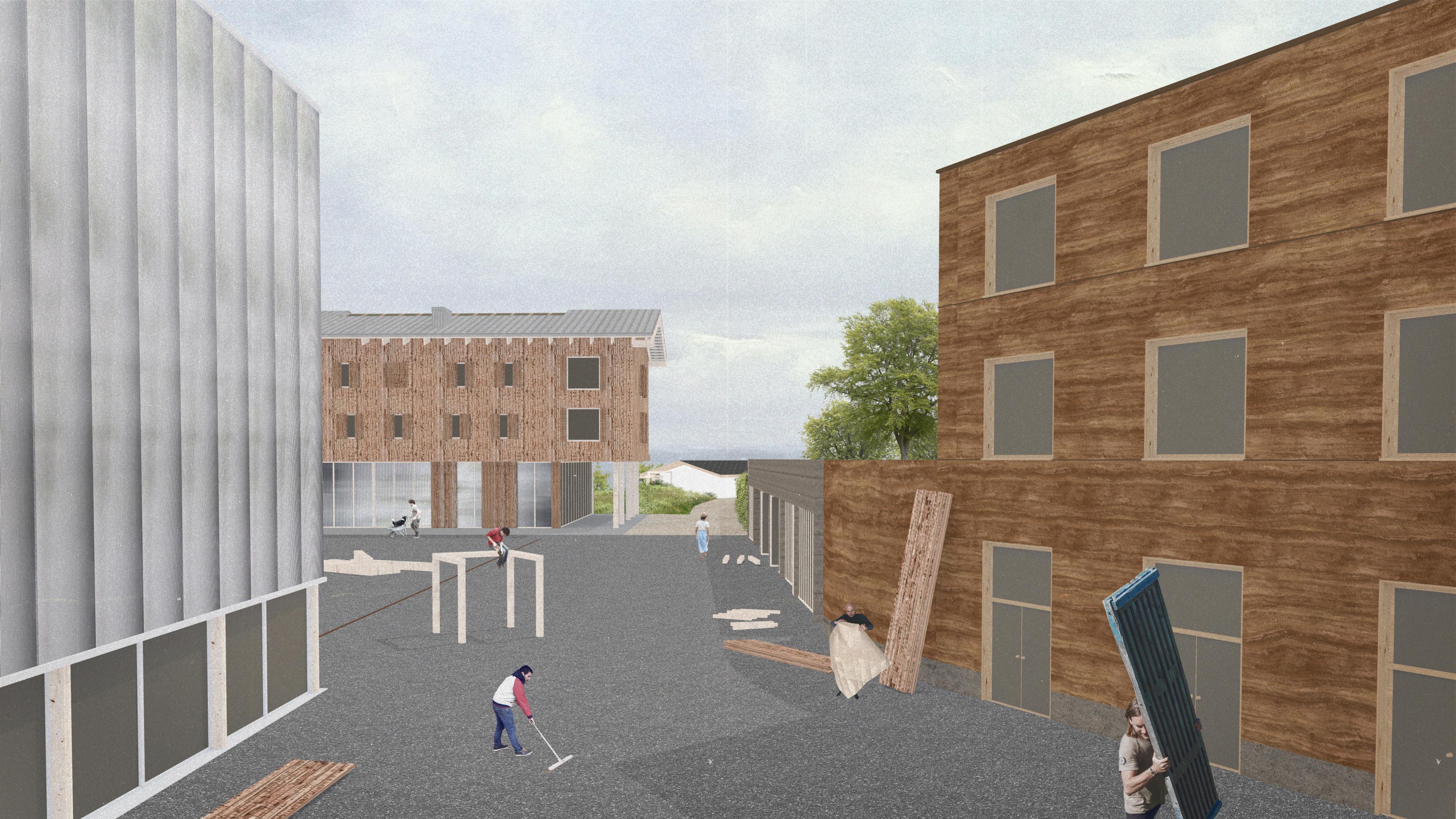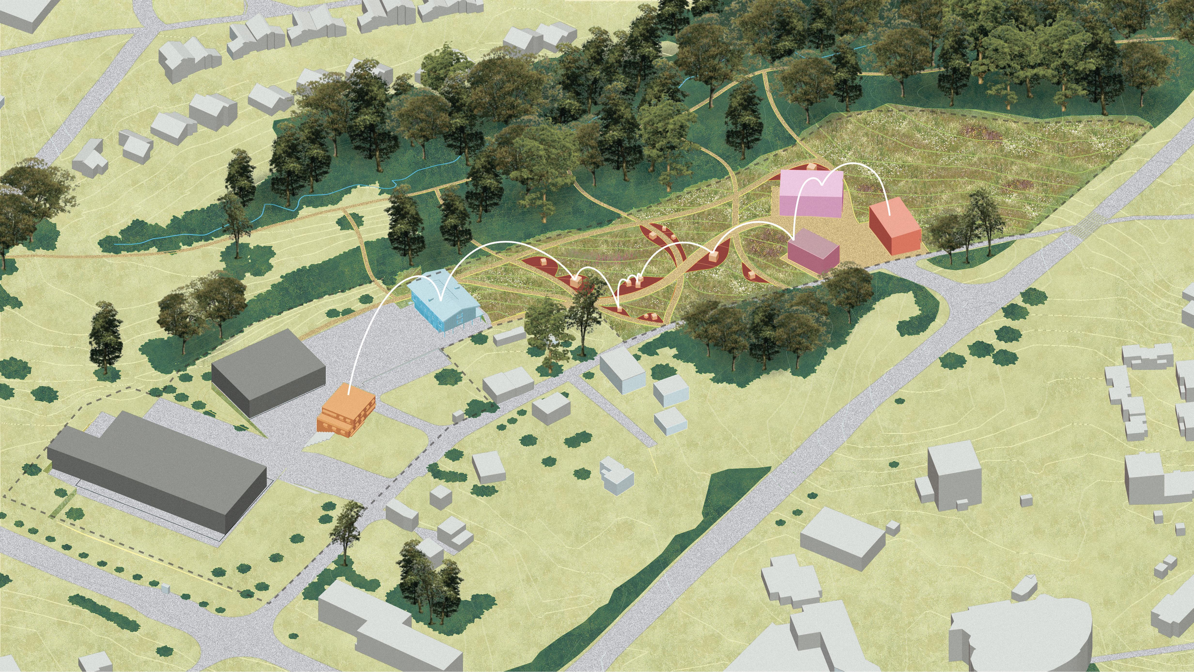 Zabudowękampusutworządwa centradefiniowaneprzezróżnych użytkowników.Częśćwarsztatowa przeznaczonajestdlastudentówi nauczycieli,maonabezpośredni dostępdoprzystankuorazparkingu. Drugiecentrumstanowirozszerzenie funkcjikampusudostępnerównieżdla lokalnejspołeczności.Posiadaono atraktorywpostacigastronomii, przestrzeniwystawienniczej, prototypóworazleśnejścieżki edukacyjnej