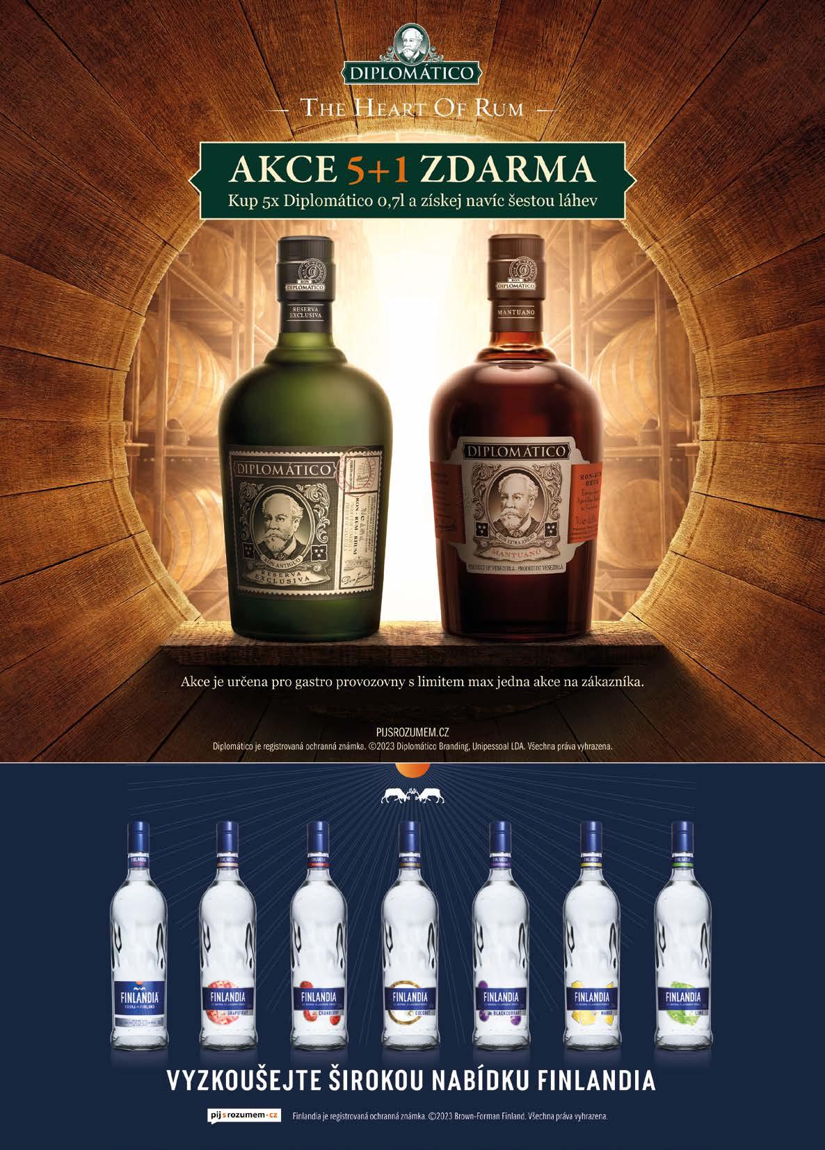 AKČNÍ LETÁK ŘÍJEN 2023 21 Finlandia Vodka 41024800 Clear 40 % 41162400 Grapefruit 41162100 Cranberry 41198300 Coconut 37,5 % • 1 l • 12 ks / balení S DPH 32149 38900 Diplomático Reserva Exclusiva 12 YO 40 % 41157000 0,7 l holá lahev 6 ks / balení S DPH 67899 82158 Diplomático Mantuano 40 % 41201900 0,7 l holá lahev 6 ks / balení S DPH 45999 55659 při koupi bal. S DPH 38333 46383 při koupi bal. S DPH 56583 68465 Finlandia Vodka 41187100 Blackcurrant 41163300 Mango 41162300 Lime 37,5 % • 1 l • 12 ks / balení