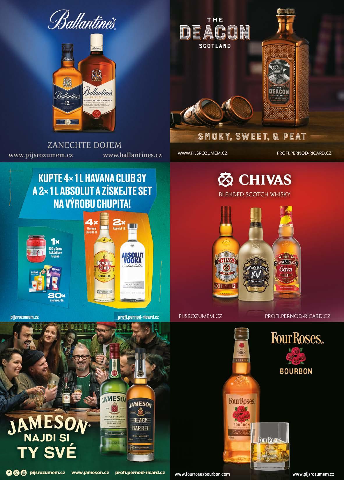 AKČNÍ LETÁK ŘÍJEN 2023 19 S DPH 60490 73193 S DPH 65990 79848 S DPH 61900 74899 Chivas Regal 42086100 Extra 13 YO 40 % • 0,7 l 6 ks / balení Chivas Regal 42127800 XV 15 YO 40 % • 0,7 l 6 ks / balení Ballantine‘s 42003500 12 YO 40 % • 0,7 l 6 ks / balení S DPH 25190 30480 Ballantine‘s 42003600 Finest 40 % • 0,7 l 6 ks / balení S DPH 34690 41975 Ballantine‘s 42003800 Finest 40 % • 1 l 12 ks / balení Deacon 42127700 Whisky 40 % • 0,7 l 6 ks / balení Chivas Regal 41032400 12 YO 40 % • 1 l 12 ks / balení S DPH 51900 62799 Chivas Regal 42004100 12 YO 40 % • 0,7 l 6 ks / balení SET 42127900 S DPH 207500 251075 S DPH 61900 74899 S DPH 90900 109989 S DPH 39990 48388 S DPH 27190 32900 Jameson 42004600 Irish Whiskey 40 % • 0,7 l 6 ks / balení S DPH 45890 55527 Jameson 42067200 Irish Whiskey Black Barrel 40 % • 0,7 l 6 ks / balení Jameson 42004800 Irish Whiskey 40 % • 1 l 6 ks / balení S DPH 28890 34957 Four Roses 42004300 Bourbon 40 % • 0,7 l 6 ks / balení