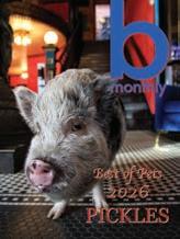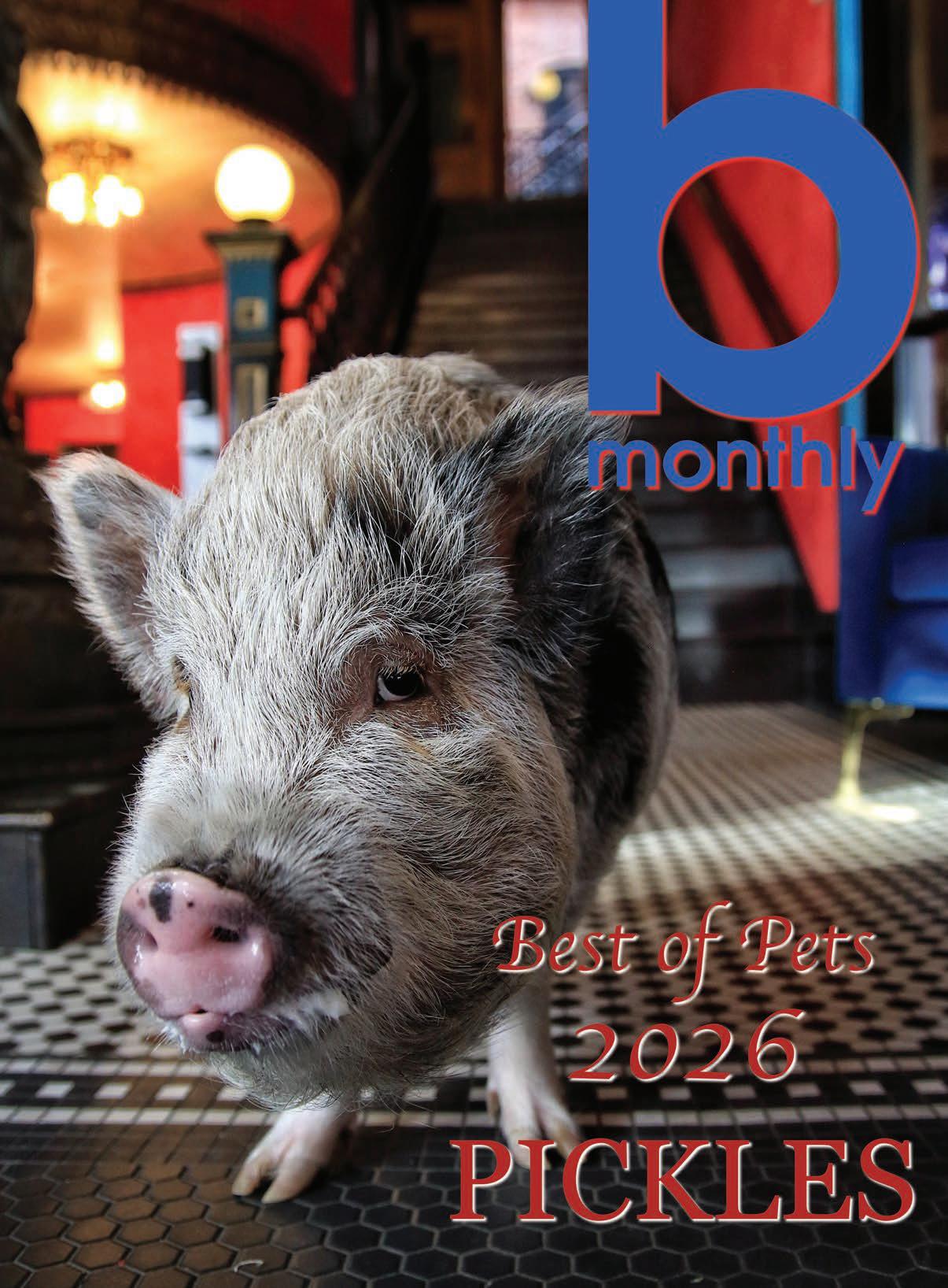Well, I never thought in the 9 years of putting these covers together that I would put a pot-bellied pig on bmonthly magazine but here we go. Our Judges’ Choice for this year’s Best of Pets 2026 cover is Pickles. Every year we send the top 15 vote getters to our panel of judges, and they select the winner. Six of the 9 judges picked Pickles. We had a blast taking this picture. Before we took this picture I was like where do I take a picture of a pig? The obvious place is a farm or ranch. I wanted something different, so I thought why not the beautiful Johnstone-Sare Building. Thank you, Crystal Sare, for letting us take this picture at your incredible building. It’s one of a kind, and that is what I love about our covers.