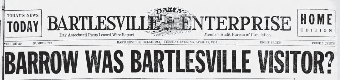 On April 17, 1934, the Morning Examiner reported “Desperado and ‘Girl Friend’ Traced Here”. A couple fitting the descriptions of Bonnie and Clyde were spotted on the west side of Bartlesville and there was a rumor the pair had planned to rob a bank here. For the next three days, heavily armed local law enforcement officers were seen by citizens staked out downtown near the banks.