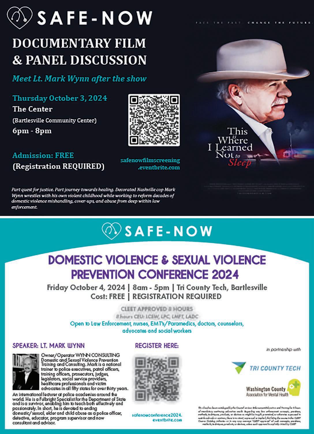 Bartlesville residents will have a chance to watch the 38-minute film. Local nonprofit SAFE-NOW is hosting a showing at 6 p.m. on Oct. 3 at The Center in Bartlesville. After the showing, Wynn will speak, and local experts will give a panel presentation on domestic violence. The recommended audience is adults, and it may be triggering for some who have experienced domestic violence themselves.