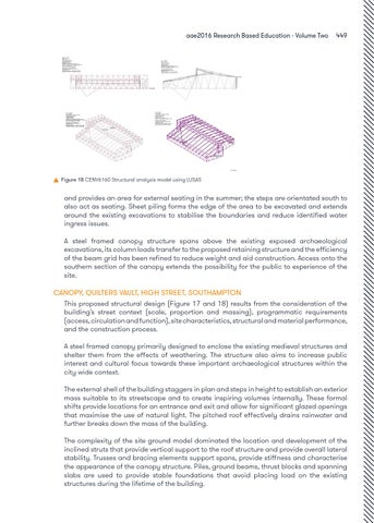 CANOPY, QUILTERS VAULT, HIGH STREET, SOUTHAMPTON This proposed structural design (Figure 17 and 18) results from the consideration of the building’s street context (scale, proportion and massing), programmatic requirements (access, circulation and function), site characteristics, structural and material performance, and the construction process. A steel framed canopy primarily designed to enclose the existing medieval structures and shelter them from the effects of weathering. The structure also aims to increase public interest and cultural focus towards these important archaeological structures within the city wide context. The external shell of the building staggers in plan and steps in height to establish an exterior mass suitable to its streetscape and to create inspiring volumes internally. These formal shifts provide locations for an entrance and exit and allow for significant glazed openings that maximise the use of natural light. The pitched roof effectively drains rainwater and further breaks down the mass of the building. The complexity of the site ground model dominated the location and development of the inclined struts that provide vertical support to the roof structure and provide overall lateral stability. Trusses and bracing elements support spans, provide stiffness and characterise the appearance of the canopy structure. Piles, ground beams, thrust blocks and spanning slabs are used to provide stable foundations that avoid placing load on the existing structures during the lifetime of the building.