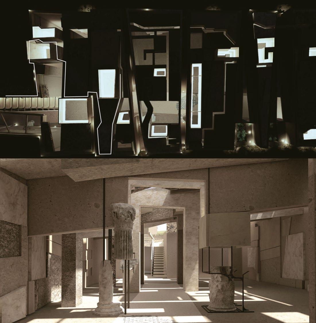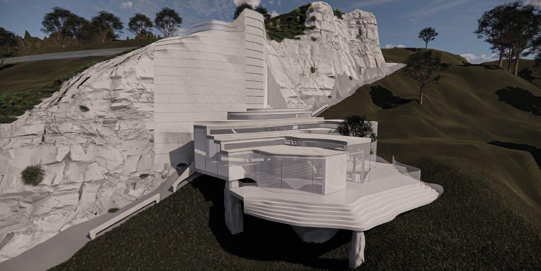 21.6–21.7 Yiwen (Yuna) Lee, Y3 ‘Whispers in Shadows’. Located at Park Güell in Barcelona, the building includes an archaeological forensics institute, a museum and an auction space. It focuses on preserving artefacts and tracing their origins to offer insights into historical living conditions. The dynamic façade provides a unique backdrop for visitors and photographers while fostering learning and cultural engagement in the community.