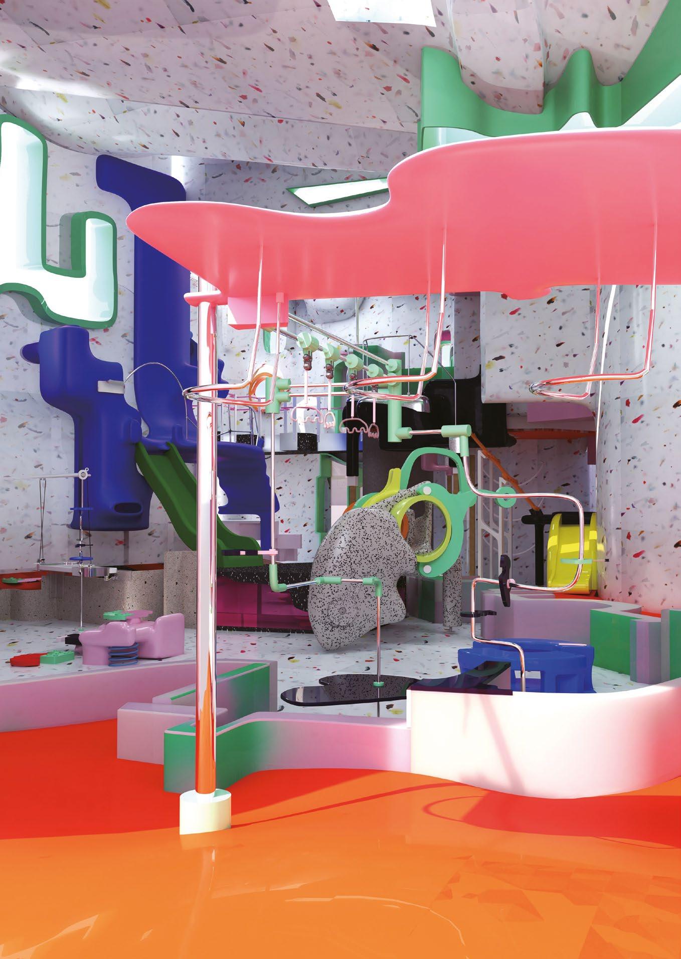 21.1 Sophie Du Ry Van Beest Holle, Y3 ‘After School Club!’. The building serves as an after school club based in Florence, Italy. Using parts from the old existing playground on the site, the programme design allows for more imaginative play by augmenting the existing pieces and using different, brightly coloured joints. 21.2, 21.8 Natalia Michalowska, Y3 ‘Parole Composte’. The project investigates how to ‘embody in architecture that which has never been embodied before’ (Junya Ishigami). In this instance, design is expressed through words. A process was developed which reconstructs words as forms and considers how architectural form can be influenced by typography. The designed building serves as a contemporary art centre with a focus on hosting digital art exhibitions and workshops – both centred around the themes of digital literacy, coding and teaching skills to bridge the digital divide by increasing access to technology.