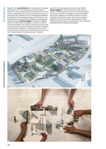 Figs. 9.6 – 9.7 James Robinson Y2, ‘Hydrodynamic Landscape and Water Archive’. The building captures the lost lakes of Mexico City. The proposal includes private laboratories, a water archive, a public park, and nutrient-emitting cranes hovering above open lakes. Different parts of the building are allowed to be flooded as the landscape fluctuates with the seasons. The architecture is a cross between a building and a scenographic landscape. Fig. 9.8 Thomas Leggatt Y2, ‘Equilibrium Weather Device’. The device looks to engage an audience to question the balance between man-made environmental issues and the human intervention required to reduce their impact. It requires constant human interaction to create equilibrium, by way of interventions that allude to man’s misuse of water and nature’s way of replenishing such natural resources. The design