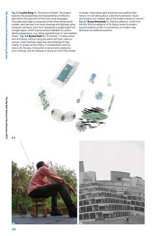 is simple. I have never seen anything more sublime than nature. I’m not talking about a dichotomy between nature and humans, but instead, about the simple oneness of nature.” Fig. X.7 Grace Simmonds Y2, ‘Kite Surveillance’. A still from the film ‘Kite Surveillance’ of Sir Denys Lasdun’s student accommodation at UEA. A commentary on modern-day dystopian surveillance systems.