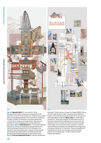 Extension’. Positioned as a critique of a flawed UNESCO listing, the 1:87 model museum’s sets, including a 35m-tall Mount Everest, have internal environments that mimic real climates with scale adjusted. Fig. 11.4 Ness Lafoy Y5, ‘A New Alpine Convention’. The project imagines an alternative future for French ski resorts which combines luxury tourism with the Alpine Convention’s mission to protect the natural heritage of the region. Pine forest test-beds, curated to ‘romantic alpine landscape’ principles, are cultivated and configured as a temporary backdrop for the resort. They are subsequently distributed to sites across the region and permanently grafted into the landscape, in order to help reconnect fragmented habitats.