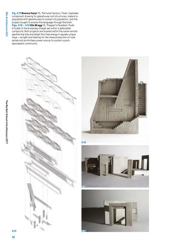Fig. 3.11 Nnenna Itanyi Y3, ‘Perfume Factory’, Fludir. Exploded component drawing for glasshouse roof structures. Iceland is populated with glasshouses to sustain its population, and the project sought to evolve this language through the brief. Figs. 3.12 – 3.14 Ella Wragg Y3, ‘Prepper’s Paradise’, Fludir. A model of the Kvoldvaka Chapel set within a defensible compound. Both projects are located within the same remote geothermal site and adopt this free energy in equally unique ways – as light and heating for the mass production of rose petals and as limitless power source to sustain a postapocalyptic community.
