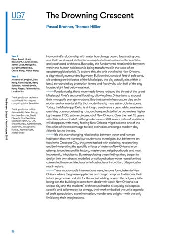 Humankind’s relationship with water has always been a fascinating one, one that has shaped civilisations, sculpted cities, inspired writers, artists, and captivated architects. But today the fundamental relationship between water and human habitation is being transformed in the wake of an escalating global crisis. To explore this, the unit travelled to New Orleans, a city virtually surrounded by water. Built on thousands of feet of soft sand, silt and clay on the banks of the Mississippi, the city actually sits within a bowl, surrounded by protection levees and floodwalls, with half of the city located eight feet below sea level. Paradoxically, these man-made levees reduced the threat of the great Mississippi River’s seasonal flooding, allowing New Orleanians to expand their metropolis over generations. But that same infrastructure also set in motion environmental shifts that made the city more vulnerable to storms. Today, the Mississippi Delta is sinking a centimetre a year, whilst sea levels are rising at an accelerating rate, and are predicted to be two metres higher by the year 2100, submerging most of New Orleans. Over the next 15 years scientists believe that, if nothing is done, over 300 square miles of Louisiana will disappear, with many fearing New Orleans might become one of the first cities of the modern age to face extinction, creating a modern-day Atlantis, lost to the sea. It is this ever-changing relationship between water and human habitation that we wanted our students to investigate, but before we set foot in the Crescent City, they were tasked with exploring, researching and (re)interpreting the specific effects of water on New Orleans in an attempt to understand its history, masterplan, neighbourhoods and most importantly, inhabitants. By extrapolating these findings they began to design their own drawn, modelled or collaged urban water narrative that culminated in an architectural or infrastructural innovation, allegorical or real in nature. These macro-scale interventions were, in some form, taken to New Orleans where they were applied as a strategic compass to discover their future programme and site for the main building project, the only requisite being that the building in some form dealt with water. New Orleans is a unique city and the students’ architecture had to be equally as bespoke, specific and tailor-made. As always, their work embodied the unit’s agenda of craft, speculation, experimentation, wonder and delight – with the only limit being their imaginations.