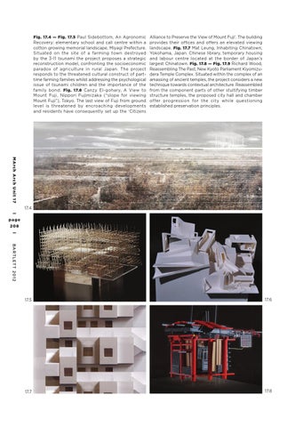 Fig. 17.4 — Fig. 17.5 Paul Sidebottom, An Agronomic Recovery: elementary school and call centre within a cotton growing memorial landscape, Miyagi Prefecture. Situated on the site of a farming town destroyed by the 3-11 tsunami the project proposes a strategic reconstruction model, confronting the socioeconomic paradox of agriculture in rural Japan. The project responds to the threatened cultural construct of parttime farming families whilst addressing the psychological issue of tsunami children and the importance of the family bond. Fig. 17.6 Canzy El-gohary, A View to Mount Fuji, Nippori Fujimizaka (“slope for viewing Mount Fuji”), Tokyo. The last view of Fuji from ground level is threatened by encroaching developments and residents have consequently set up the ‘Citizens