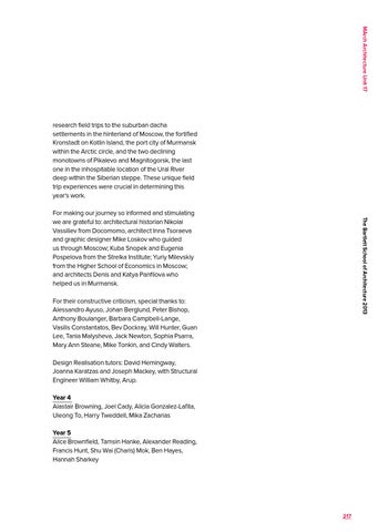 For making our journey so informed and stimulating we are grateful to: architectural historian Nikolai Vassiliev from Docomomo, architect Inna Tsoraeva and graphic designer Mike Loskov who guided us through Moscow; Kuba Snopek and Eugenia Pospelova from the Strelka Institute; Yuriy Milevskiy from the Higher School of Economics in Moscow; and architects Denis and Katya Panfilova who helped us in Murmansk. For their constructive criticism, special thanks to: Alessandro Ayuso, Johan Berglund, Peter Bishop, Anthony Boulanger, Barbara Campbell-Lange, Vasilis Constantatos, Bev Dockray, Will Hunter, Guan Lee, Tania Malysheva, Jack Newton, Sophia Psarra, Mary Ann Steane, Mike Tonkin, and Cindy Walters. Design Realisation tutors: David Hemingway, Joanna Karatzas and Joseph Mackey, with Structural Engineer William Whitby, Arup. Year 4 Alastair Browning, Joel Cady, Alicia Gonzalez-Lafita, Uieong To, Harry Tweddell, Mika Zacharias Year 5 Alice Brownfield, Tamsin Hanke, Alexander Reading, Francis Hunt, Shu Wai (Charis) Mok, Ben Hayes, Hannah Sharkey