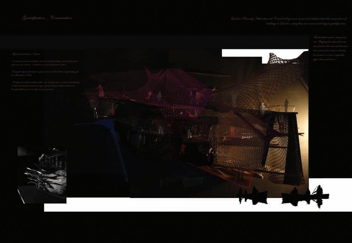 the sensory states of the service. Fig. 6.4 Chengcheng Peng, Y3, Community Centre, external render showing overall building within context. The building offers supporting groups for expectant mothers and a short stay creche, and workshop classes to educate the local adults. Waste products from the workshop would be recycled as aggregate for concrete construction in the local area. Fig. 6.5 – 6.6 Joyce Chen, Y2, internal view of submerged theatre and final model. By reutilising the basement foundations of the old cinema on site the building physically and socially reconstructs Peckham’s performing arts culture. Constructed from the excavated earth and gabions, the auditorium is submerged into the site. Revolving mechanistic doors are an important feature, opening out onto pocketed gardens during the summer.