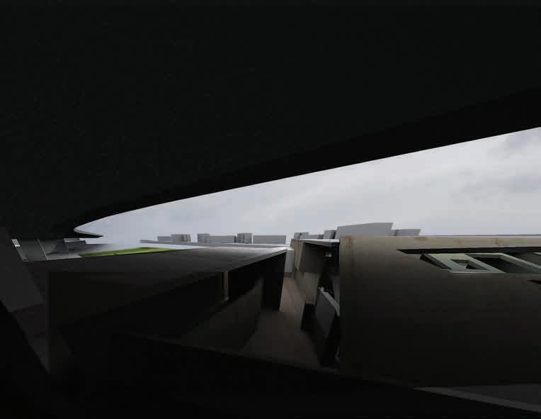 rainwater into an outdoor ‘ice bar’ in winter. Fig. 6.10 Olivia Hornby, Y2, Peckham Music Centre, short section. A community centre with auditorium, music school, cafe and musical therapy centre. To acheive acoustic isolation, the building is suspended over public open space where each acoustic space is suspended in a specific way to acheive desired musical qualities, whilst the public space below is left open to the elements. Fig. 6.11 Max Butler, Y2, Mixed Income Housing Association, view of overall scheme, shifting from roof plan (bottom) to elevation (top). A diverse mix of interlocking residences enclose multi-level gardens and a range of communal facilities. Adjactent to streets running through the scheme sit semi-public shared gardens. Residents are encouraged to occupy and ammend these spaces.