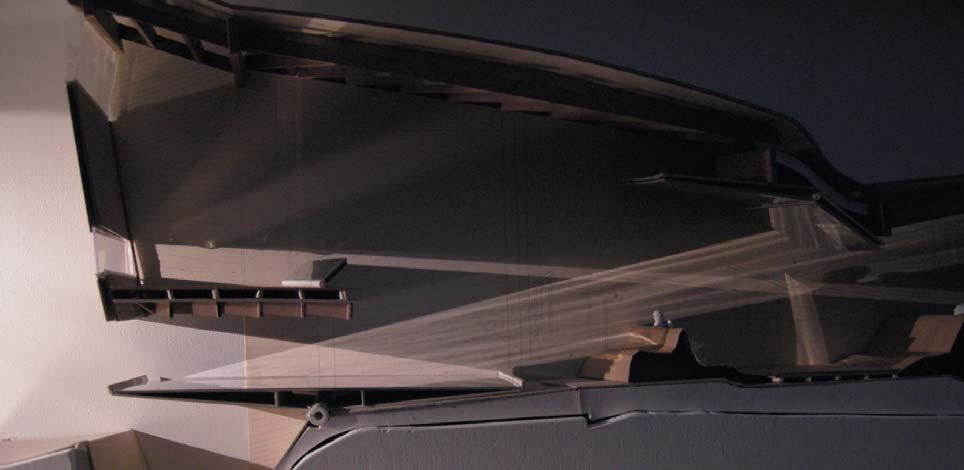 Fig. 6.12 Nadia Wikborg, Y3, Launderette & Sheltered Housing, sectional model and ground floor plan. The building brings the community of Peckham together in a landscape of fragrant lemon trees and freshly aired laundry, inviting the public to interact with the elderly residents through a lemonade cafe as well as a public garden where they can meet and exchange stories. Fig. 6.13 Chris Straessle, Y2, A light intervention on an otherwise empty park. The main part of the building is a black box theatre, where this particular theatre design can be easily adapted to many types of performance requirements. And in response to the landscape, the building also has an open-air theatre. The theatre’s double skin envelope encases pockets of inhabitation where it widens, and folds out onto the parkscape.