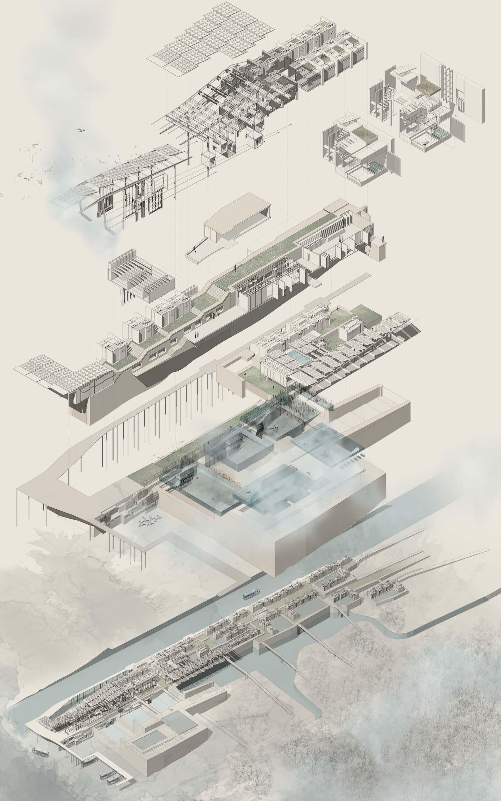 flood zone, harvesting the tide in order to generate energy. The development is suspended above a series of water gardens which absorb tidal surges and mitigate flooding on a larger scale.